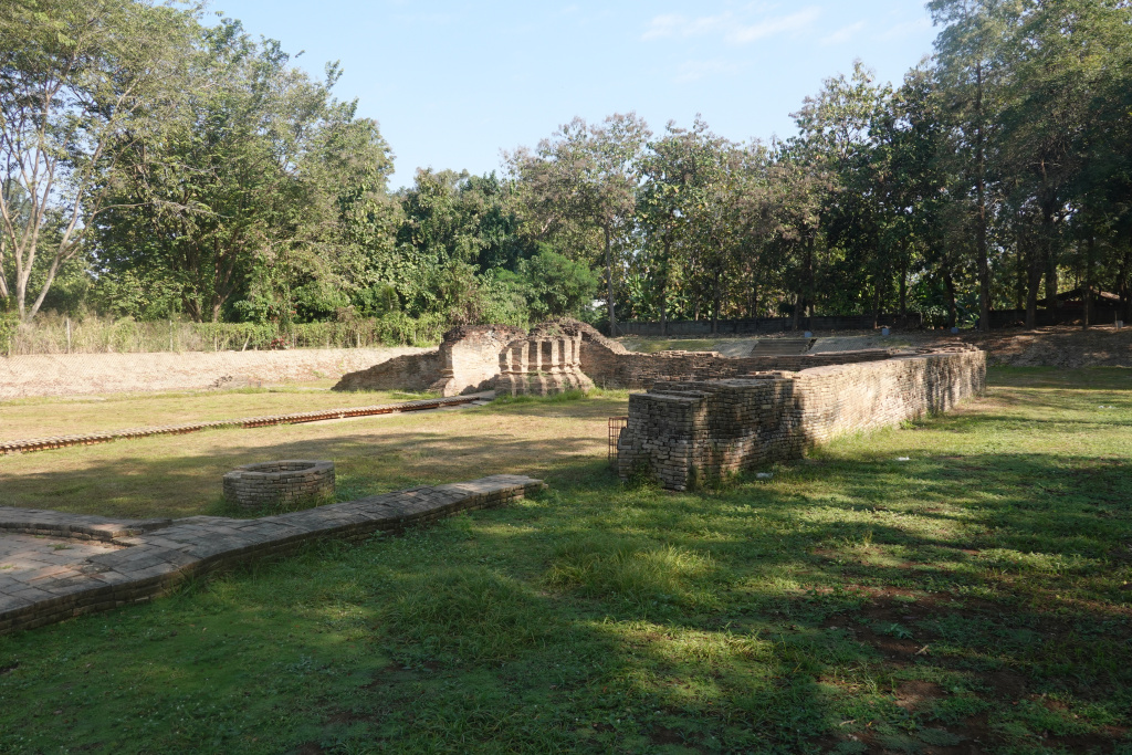 Another view of the ruins at Wat Nan Chang. Notice that the ruins are below the ground level outside the excavation site. This view is a more spacious part of the temple grounds. Also, note parts of what was likely a wall around the temple.