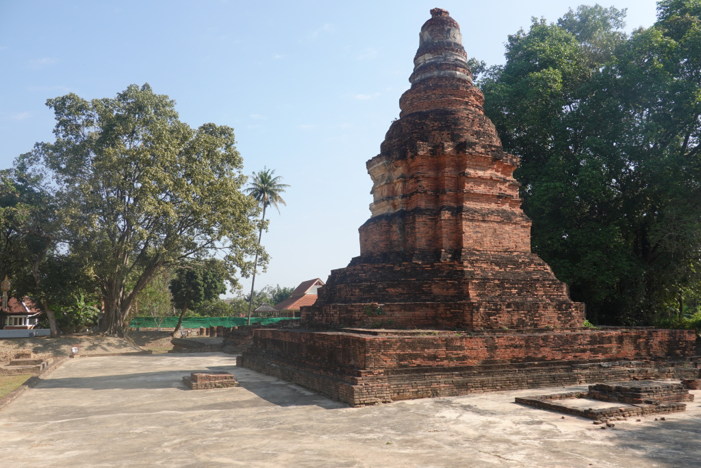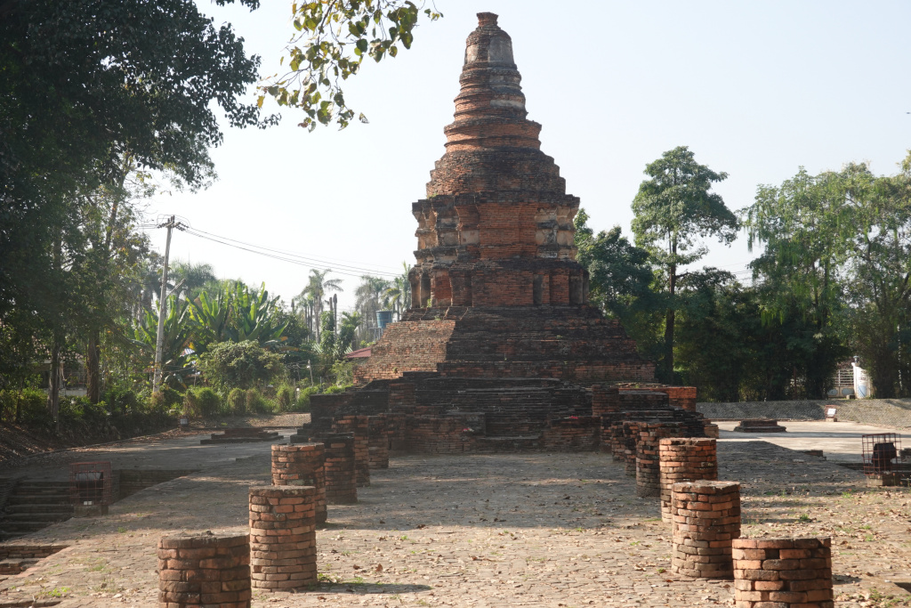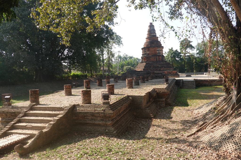 Wat E Khang is one of the most impressive ruins in all of Wiang Kum Kam. There is the foundation of a large viharn and, most surprisingly, a nearly intact chedi connected by a brick pathway. At the rear of the viharn are stairways on each side leading up to the platform surrounding the chedi. The area around the stupa is meant for use as a circumambulation path. In this practice, worshippers walk circles around the chedi in a clockwise direction in order to pay tribute to the sacred object (in this case the relic within the chedi) and gain merit (a credit toward reincarnation).