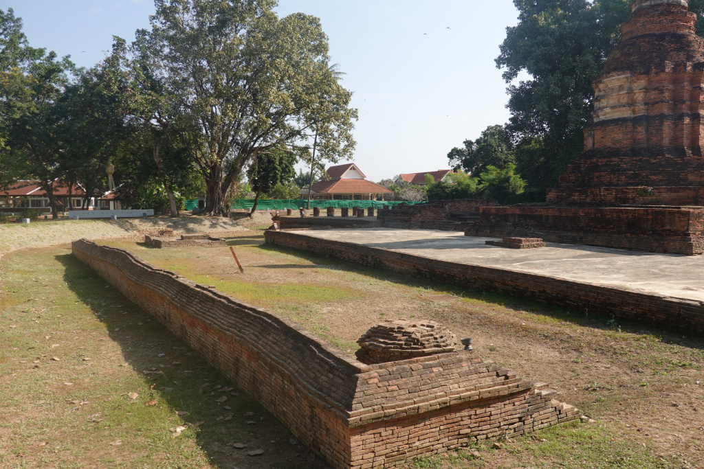 There is a foundation for a very small ubosot alongside the viharn. It is small for the viharn and chedi this big. Also, both the viharn and ubosot entrances are to the north, whereas almost all Buddhist temples, including those at Wiang Kum Kam face east.