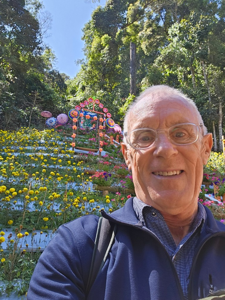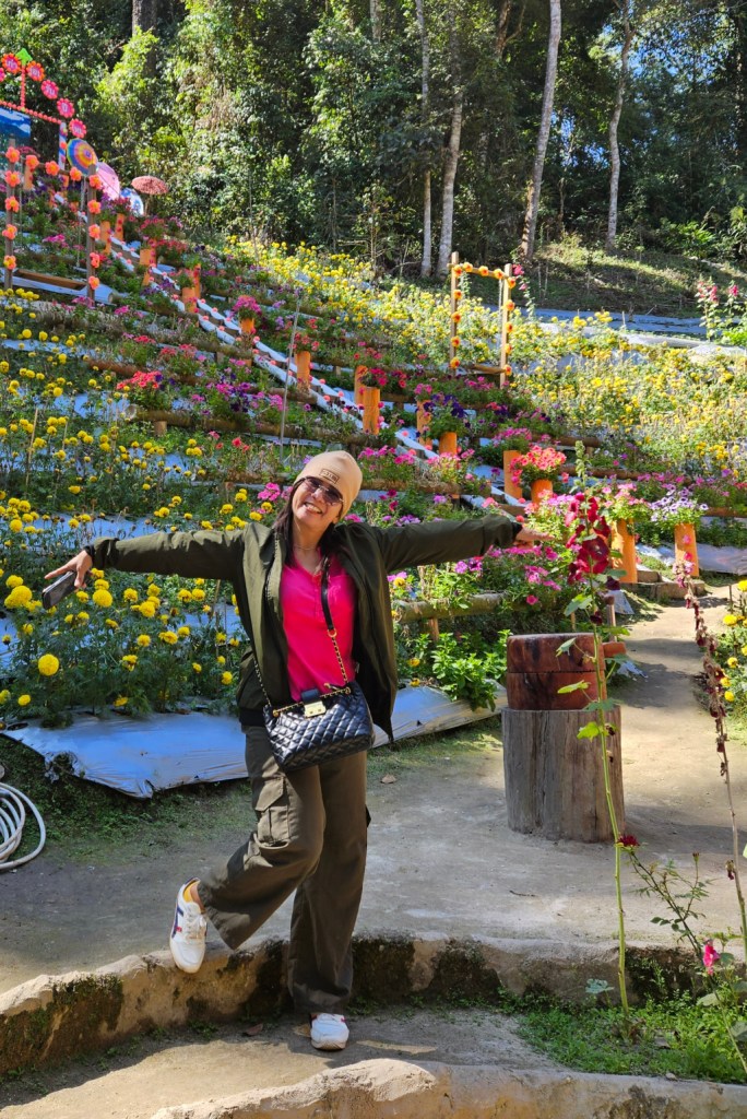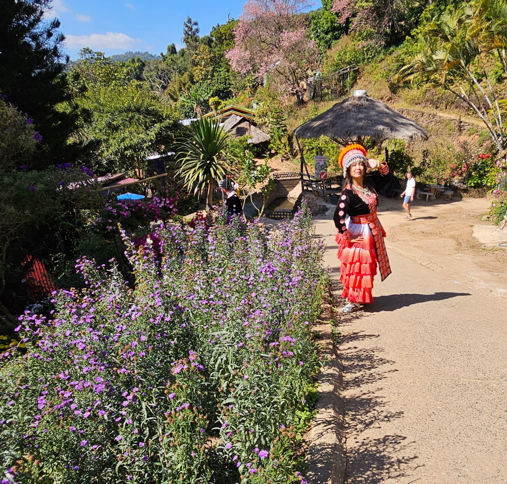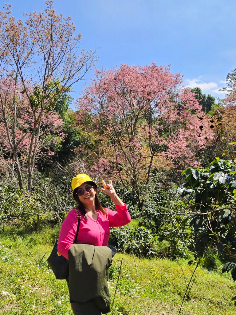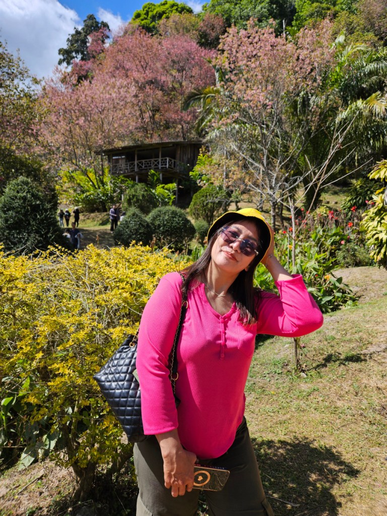 The road after Wat Phra That Doi Suthep is very narrow. I know this road because Rudy and I hiked down this road a few weeks ago after we had been a little lost in the forest. We got to Khun Chang Khian and stopped at the same coffee shop at which Rudy and I took a break. We did not see many Sakura, and learned that the best Sakura viewing was back down the road a few kilometers. So after a coffee and food break, we headed down to the viewing area. On the way, Mukda decided to stop at a flower garden area just off the main road – another photo opportunity. So here I am at the flower garden, and another of Mukda there.