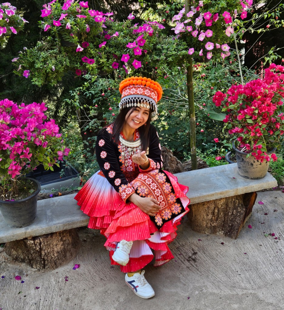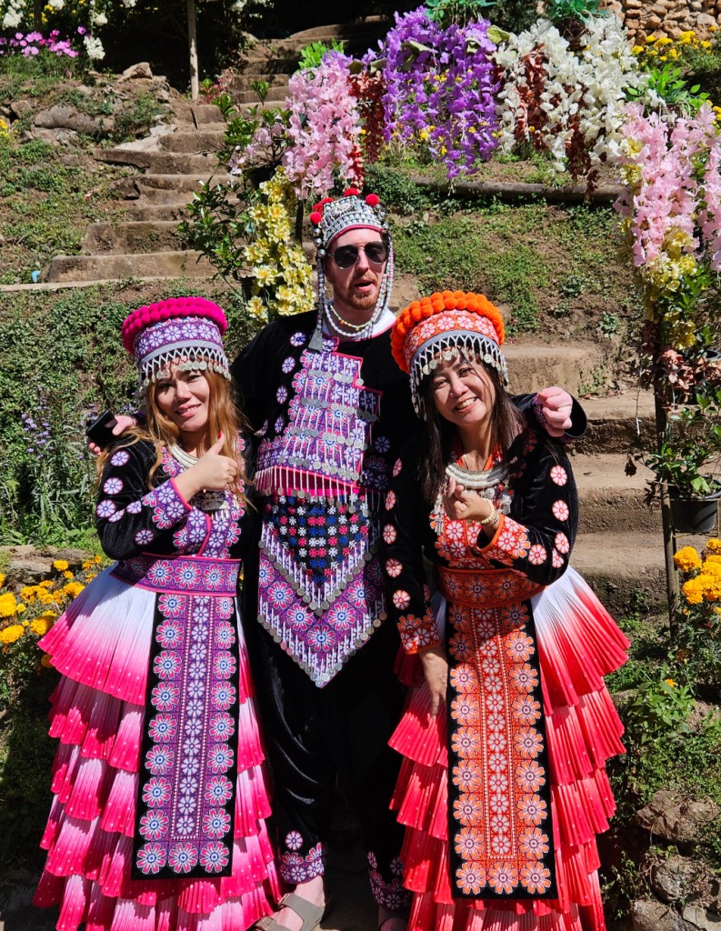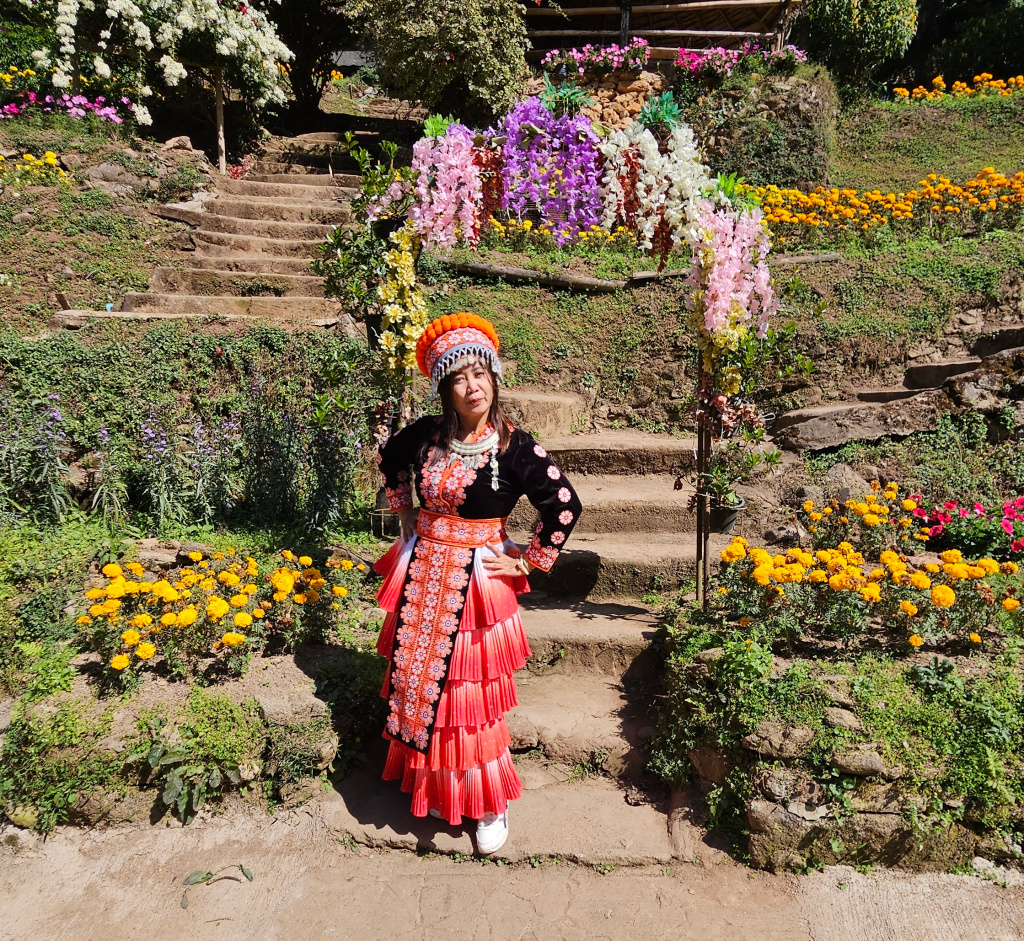 So on to the Hmong hilltribe village. This village has become more and more popular, and it seems to me that there is little “authentic” about it. It is now a means of selling to tourists. There are some large gardens to see, but mostly it is clothing and food stalls. At one place, you can put on authentic traditional Hmong hill tribe dress clothing and have that on for your photo opportunities. Mukda, Yui, and Laurence all got dressed up. I was not into it and passed, opting instead to take many, many photos of them in their tribal dress. Here are a couple: