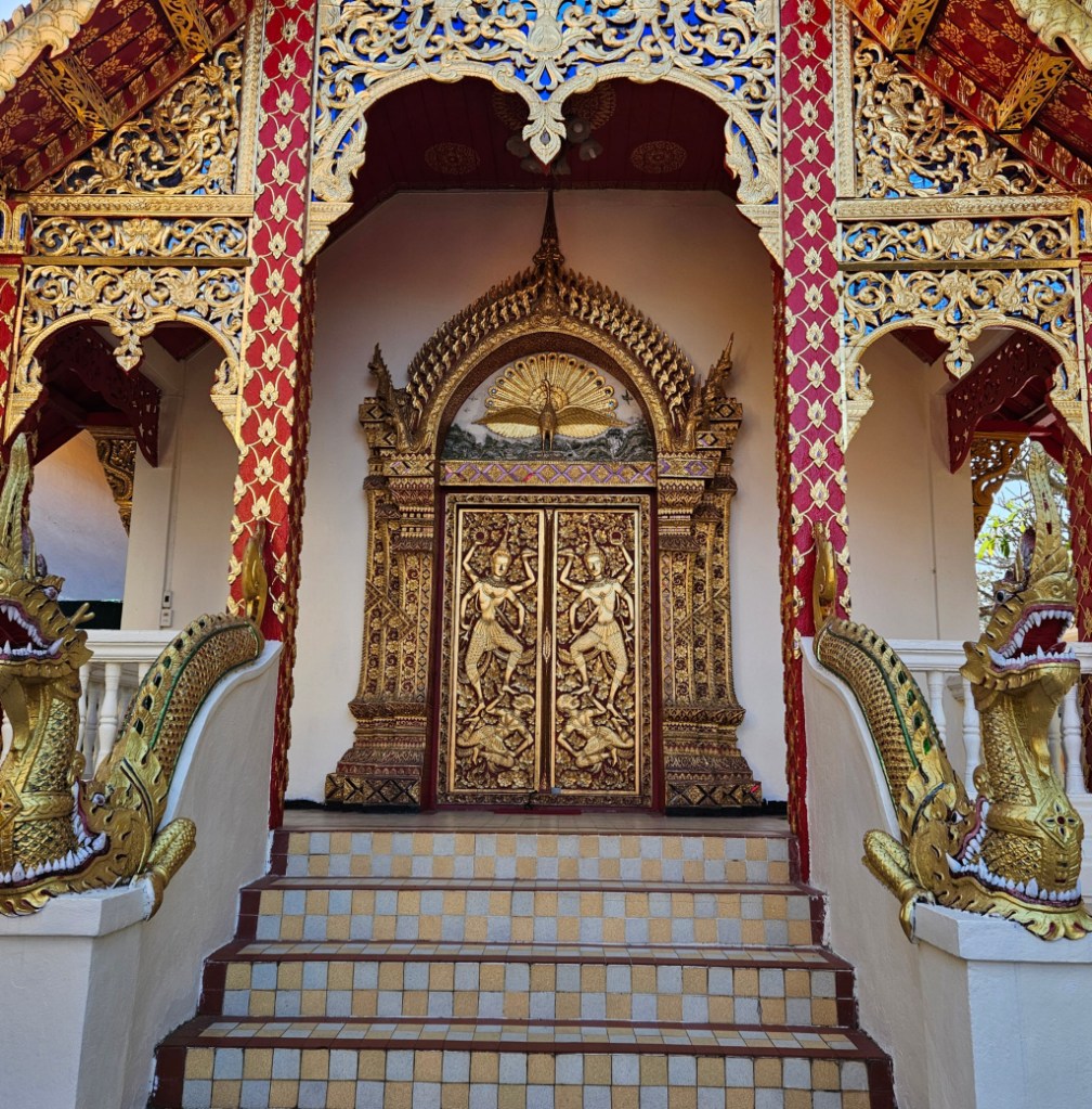 Then we left the inner temple area and walked around the outside. I have published many photos of the dancing thewada (pronounced “tay wah da”, essentially angels) on these doors. They always make me smile.