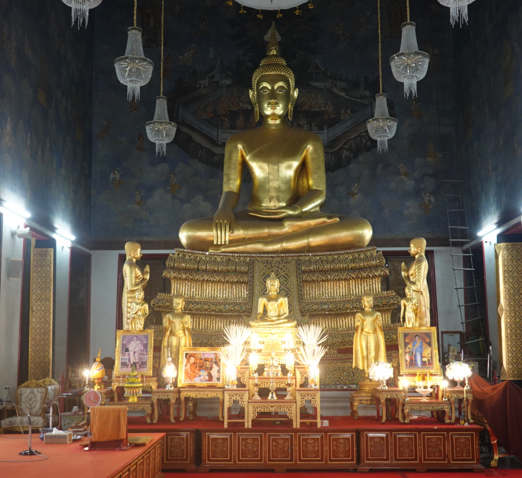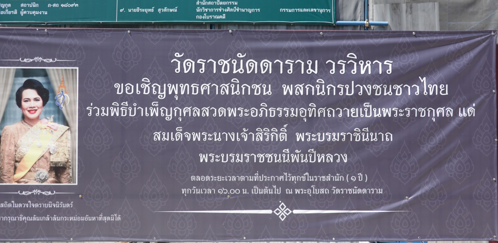 Sirikit was consort to the monarch who became the world’s longest-reigning head of state, so she held the distinction of being the world’s longest-serving queen consort. Sirikit suffered a stroke in 2012 and subsequently withdrew from public life. She passed away a few weeks ago on October 24, 2025 at the age of 93. Both Queen Sirikit and King Bhumibol Adulyadej were loved deeply by the Thai people because it was clear from their actions during their long reign that they held the best interests of the Thai people as their priority. Thailand is now in a year of official mourning for the loss of Queen Mother Sirikit. Her photo with a tribute is on large banners in many places, this one here on the temple grounds.
