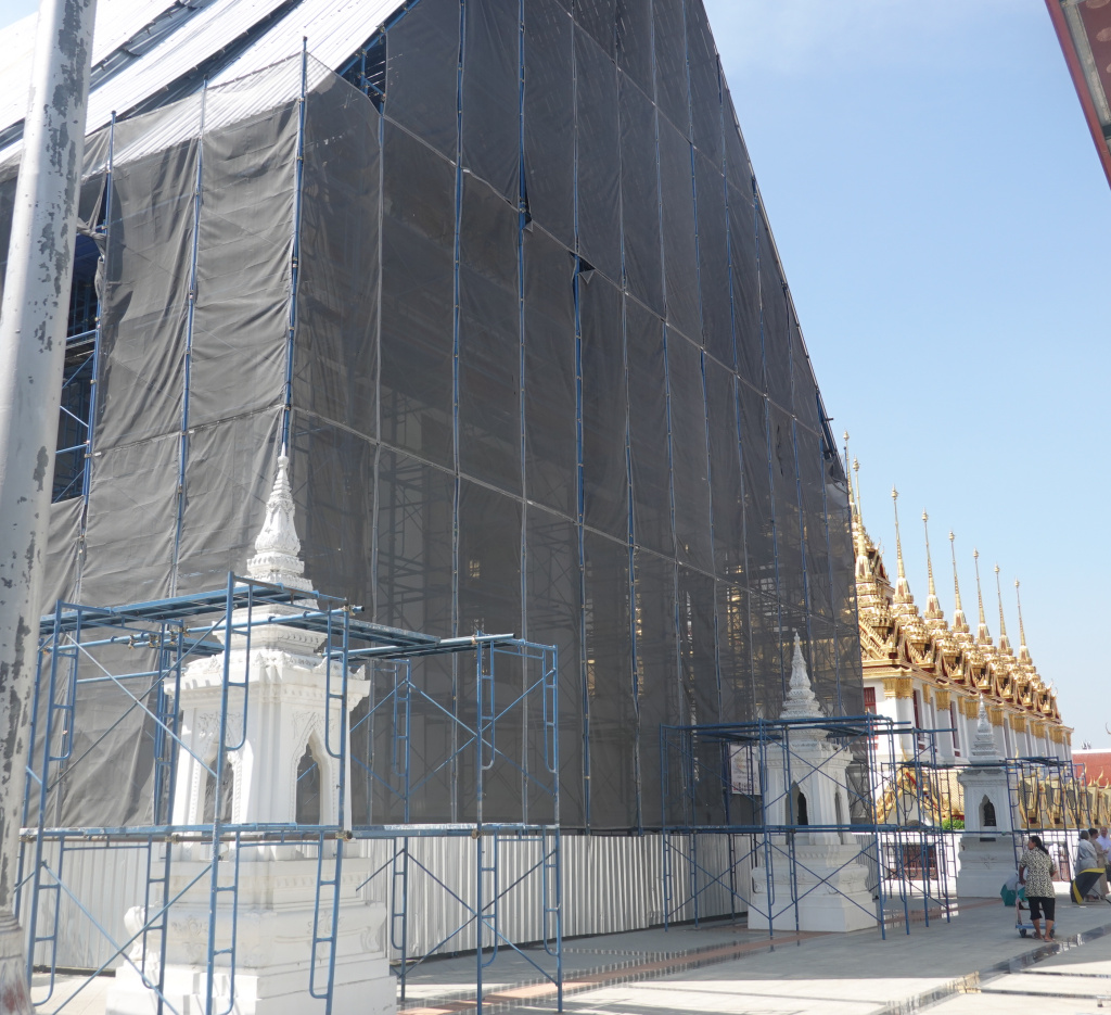 I could not find a way inside that structure. I did get behind the renovation netting on the main assembly hall to see (briefly) the large Buddha statue there. It is a striking view.