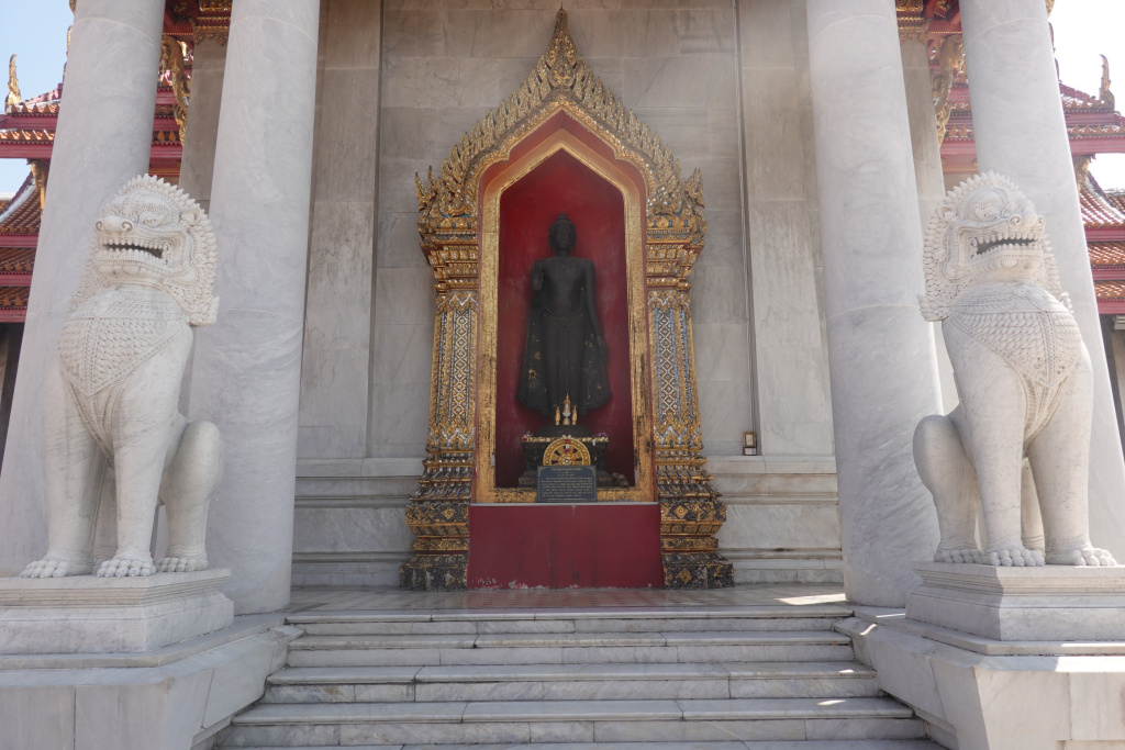 Construction of the temple began in 1899 at the request of King Chulalongkorn after the construction of his palace nearby was complete. The temple’s formal name means “the Temple of the fifth King located near Dusit Palace.” It was designed by Prince Naris, a half-brother of the king, and is built of Italian marble. Unlike the Iron Temple I had visited before, Wat Benchamabophit has a large and dramatic entrance area. Stepping into the temple grounds through an ornate gate, I took this photo of the main assembly (worship) hall: