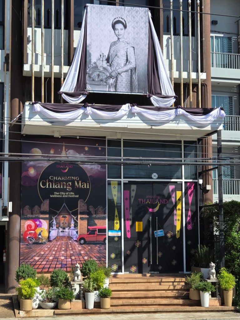 Walking back from somewhere along the Mae Ping River, I passed the front doors to the Chiang Mai office of the Tourism Authority of Thailand (known as the TAT). They typically have an elaborate decoration for the year end holidays. Looking across the street, I saw that they, too, have a display honoring the passing of the Queen Mother Sirikit. Very nice. It is unclear how that relates to what looks like a photo of a Songthaew (Red Truck) and Samlor (three-wheeled bicycle, predecessor to the motorized tuk-tuk) in the lower left.