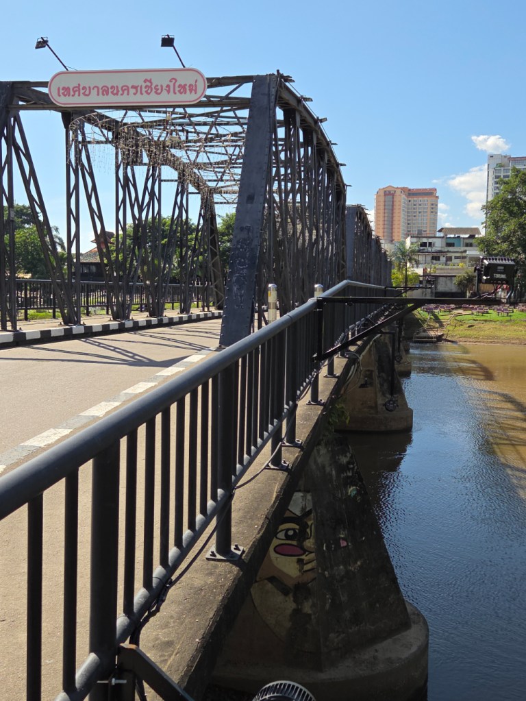 Across the street from the Tourism Authority office is the Iron Bridge. In Thai, the term is Saphan Lek, Saphan Khua Lek, or just Khua Lek. Saphan means “bridge” and Khua sort of means connector. It seems that Khua Lek is essentially a nickname for Saphan Lek. I’ll take more photos of the Iron Bridge after or if it gets decorated to the holidays. In recent past years, the bridge has been beautifully decorated. Here is a photo as I was about to cross. The sign over the bridge says, “Chiang Mai Municipality.” There are no spaces in phrases or sentences in Thai, a space delimits a sentence. (How do they know where the words are … it’s their language, they know.)