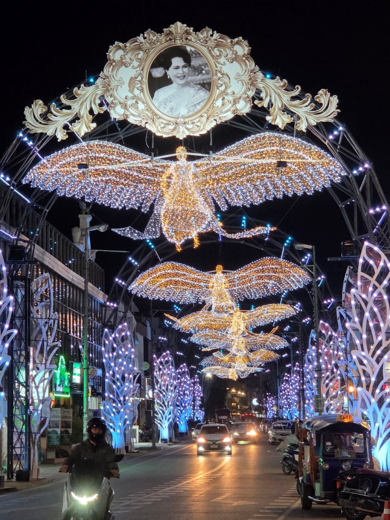 In recent years, Tha Phae Road has been highly decorated for the holidays. This year, with the Kingdom still in the official year-long mourning period for the passing of the Queen Mother Sirikit, the decoration honors her, with her photo and what look like angels. Quite dramatic. I took photos on two different evenings. The color of the lights changes, so I got two different looks.