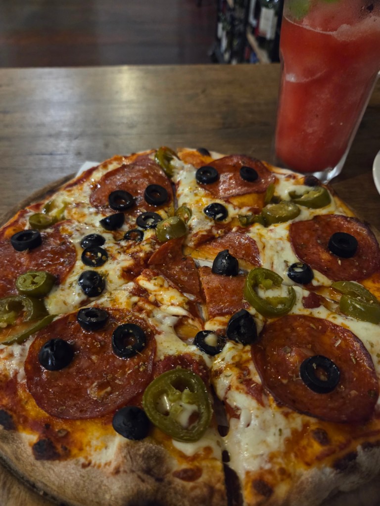 On one of those evenings, I walked down to Street Pizza and Wine House. The interesting photo is not the pizza (it is a very good pizza), but the almost chandelier light made up of at least 100 clear wine bottles. I have tried to count the bottles in the past, but always lost count. I do like the this light.