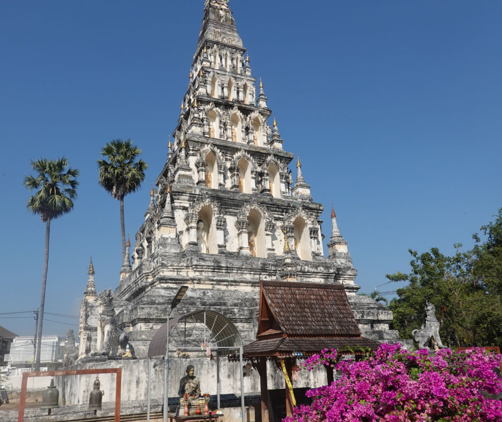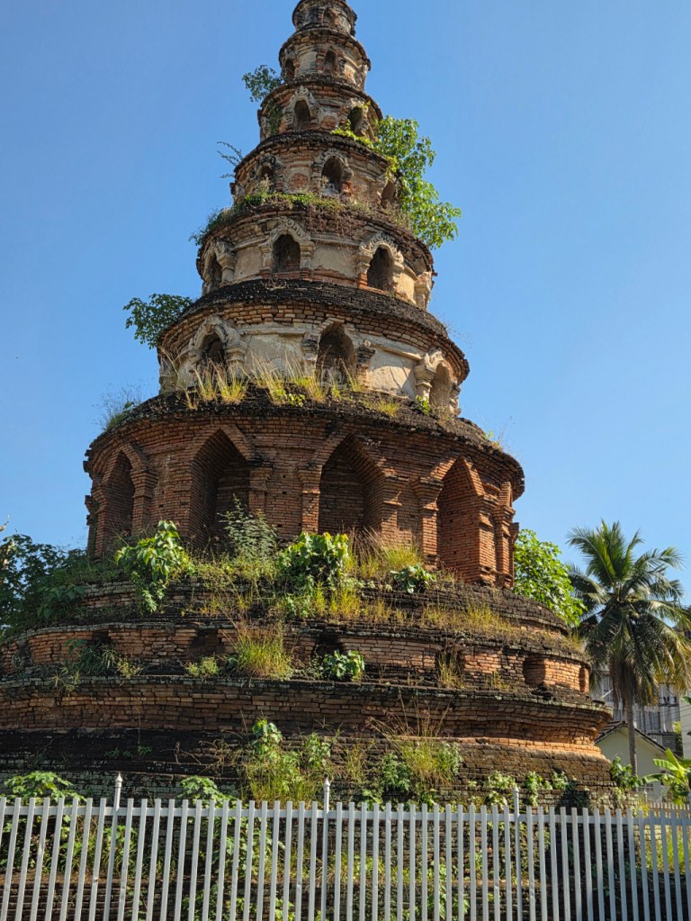 A few similarly styled chedi do exist in Chiang Mai. The chedi at Wat Santitam north of the old city, and the chedi at Wat Chedi Liam in Wiang Kum Kam are two examples. They are square-shaped compared to the round shape of the Chedi Si Phuak Hong. I found the following quote (but lost the reference), “It was either influenced by Yunnanese architecture (southwestern China) or it is a circular version of the stepped Mon chedi of the Wat Ku Kut in Lamphun.”