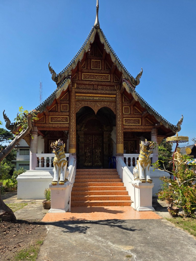 The entrance to the temple is guarded by a pair of Chinthe mythological lions, which is frequently an indicator of Burmese style temples. Although the roof looks very much Lanna-style to me.
