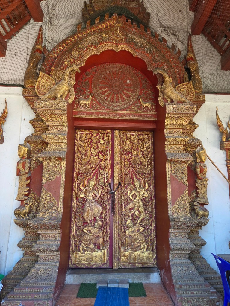 The thewada (angelic beings that live in the heavenly realms) dancing on the yak on the viharn doors reminds me of the similarly devorated doors at one of the viharn at Wat Phra That Doi Suthep.