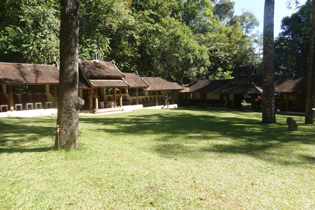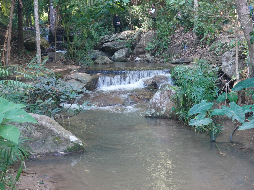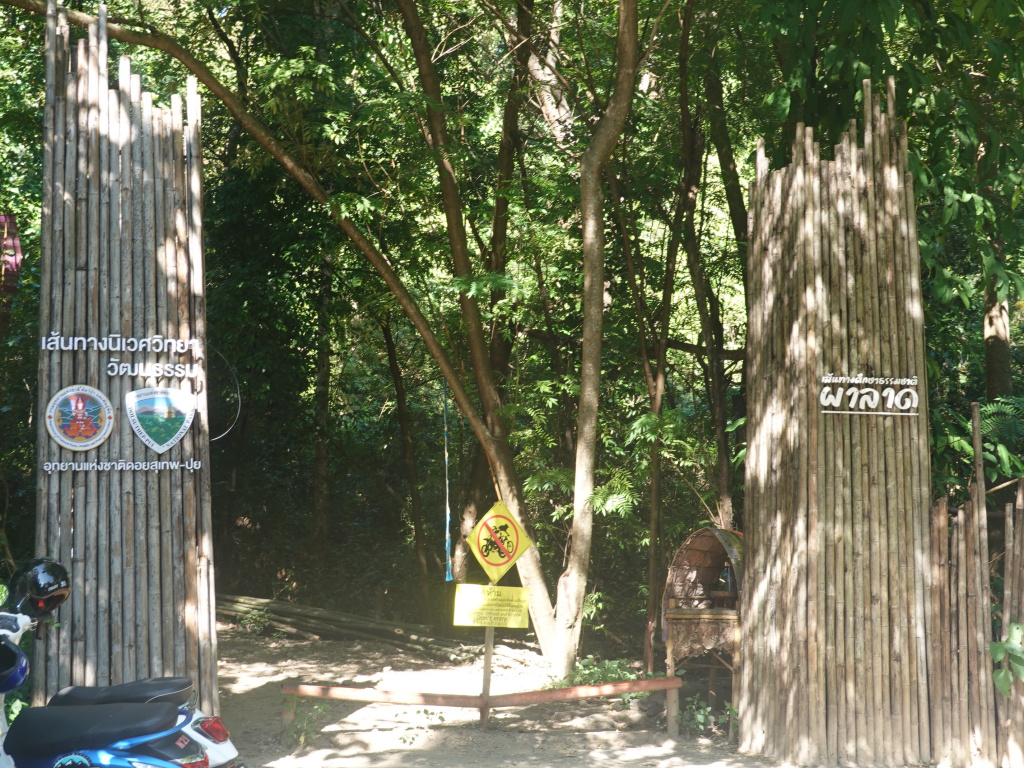 Today, the Monks Trail trailhead is on all social media as well as Google Maps, so many people now enjoy the hike in the forest to a very peaceful temple, getting the same experience I came to love. Starting this year, the trail is under the auspices of the National Park System, so there is a charge of 100 baht for foreigners (about $3). Not so bad – trail maintenance does cost something. The place to pay the fee is about 200-250 meters before the trailhead. The trailhead has been dramatically improved, as shown in the following photo. The Thai on the left says, “Ecological and Cultural Path, Doi Suthep Pui National Park.” On the right is, “There is a way to Study Nature. Pha Lad.”