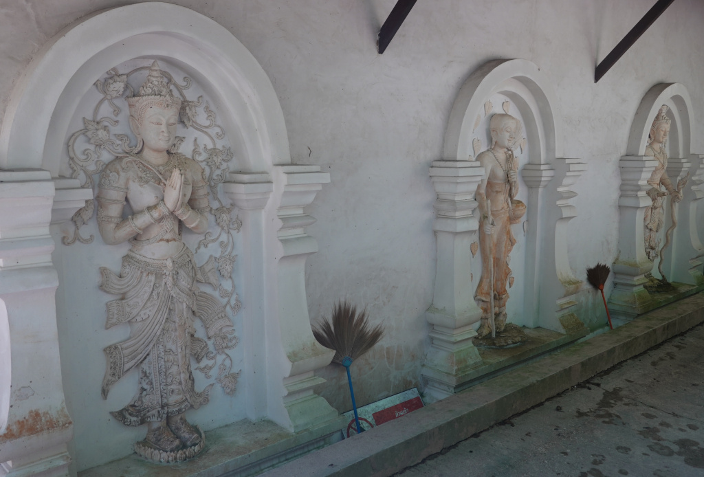 Something new that caught my eye was the side of the viharn down below the chedi. I am positive it is not “new,” but I had never noticed it as I did today. (Maybe it was cleaned and/or restored recently, so more noticeable now.) There are three large, carved thewada (angelic beings that live in the heavenly realms) carved on stucco on the side wall. Very striking, and very elegant.