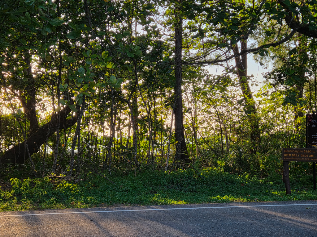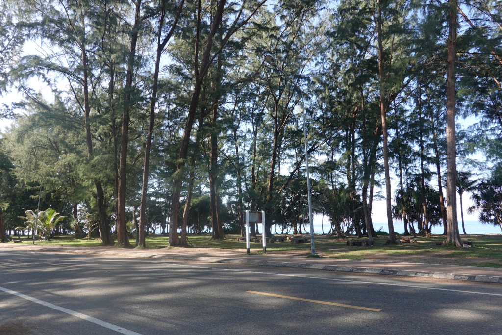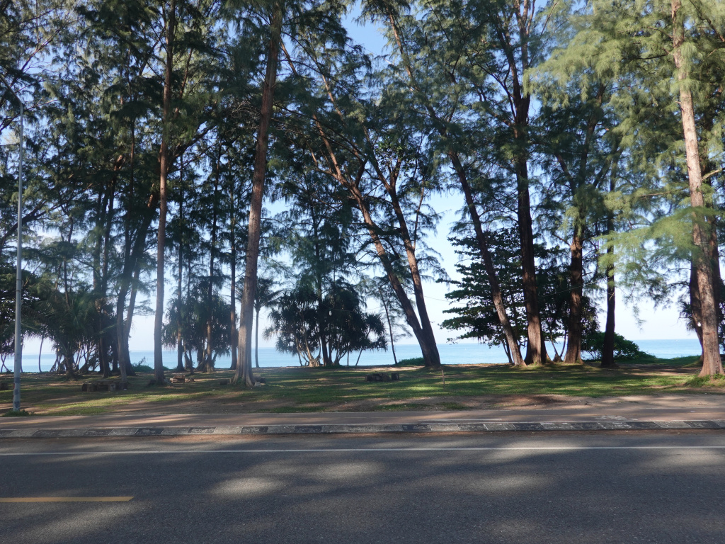 Almost all along the Thai Mueang Beach Road there is a 15-20 meter wide swath of trees between the road and the actual beach. In some places, the trees are sparse, and in others, quite dense. Here are a couple of photos from the road itself looking towards the beach. And, yes, the two views look very much the same even though they were taken a good distance apart.