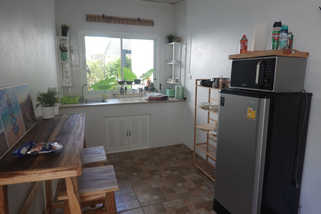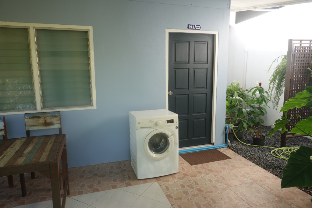 There is a kitchen if I wanted to cook for myself. Right outside the front door is a washer, and there is a clothesline nearby.