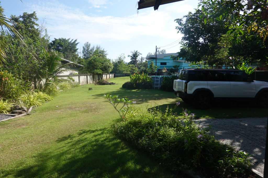 Stepping out the front door, looking to the back, there is a decent-sized backyard with an above-ground pool. Looking to the front, past Tim’s house is the gate to the beach road, then across the beach road is the beach and ocean.