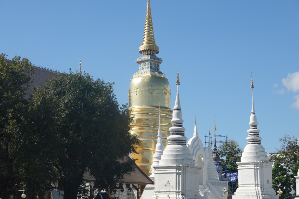 Walking back to the main part of Wat Suan Dok and the main road, I took another photo of the large gold chedi. The smaller chedi structures surrounding it are under renovation, and I saw many men climbing up the scaffolding.