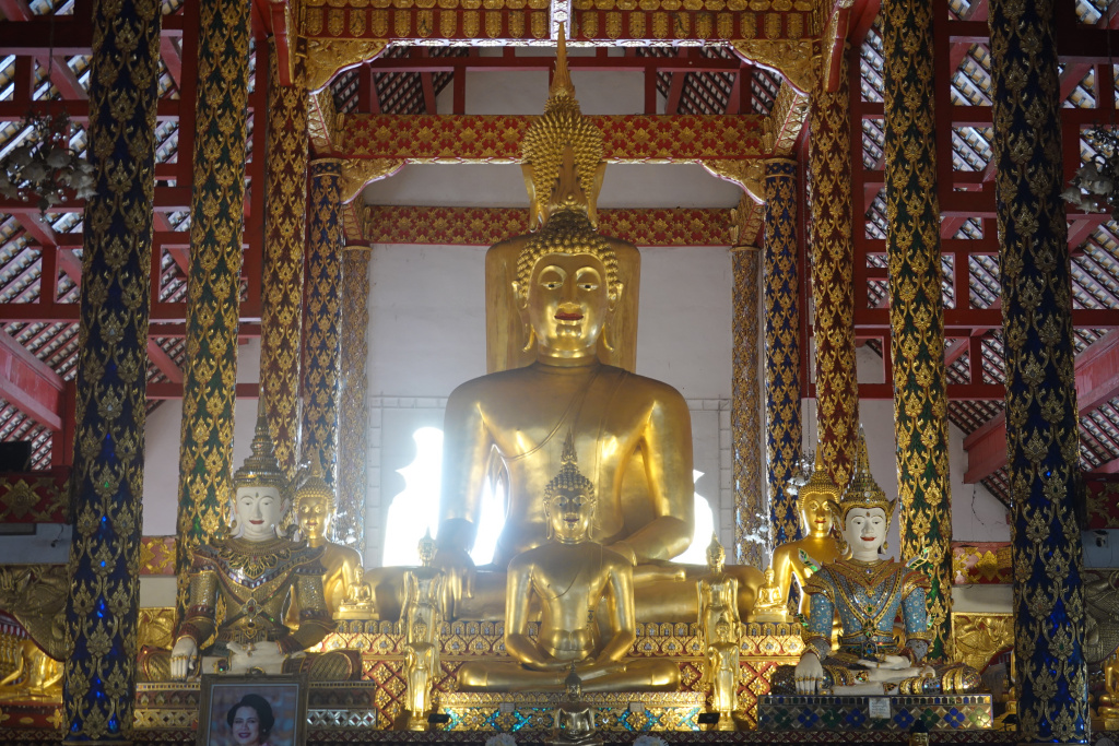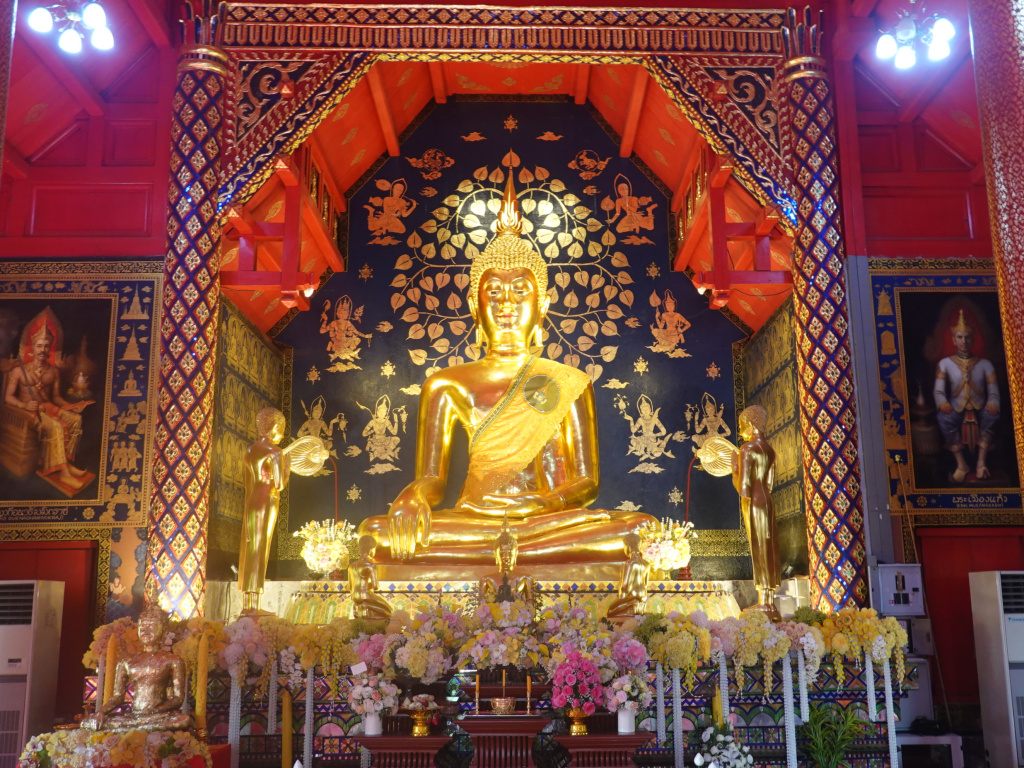 According to information displayed at the temple, King Muang Kaew (ruled Chiang Mai 1495‑1525) commissioned a craftsman from Chiang Saen to create this statue 1n 1504. The king originally planned to relocate it to Wat Phra Singh, but the statue proved too massive to move safely. Consequently, he chose to construct an ubosot on the spot to house the Buddha permanently. The Prajoe Kao Tue Buddha is a large, 4.7-meter-tall (15.4 feet) bronze Buddha statue. It is a masterpiece blending Sukhothai and Ayutthaya artistic styles, with elongated finger phalanges characteristic of Sukhothai and clothing features reflecting Ayutthaya influence. The statue is made up of nine pieces and is revered as a significant cultural and religious artifact.