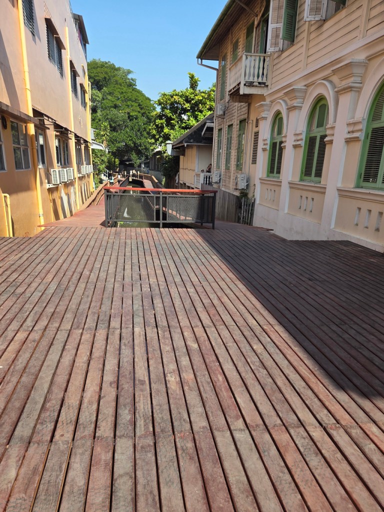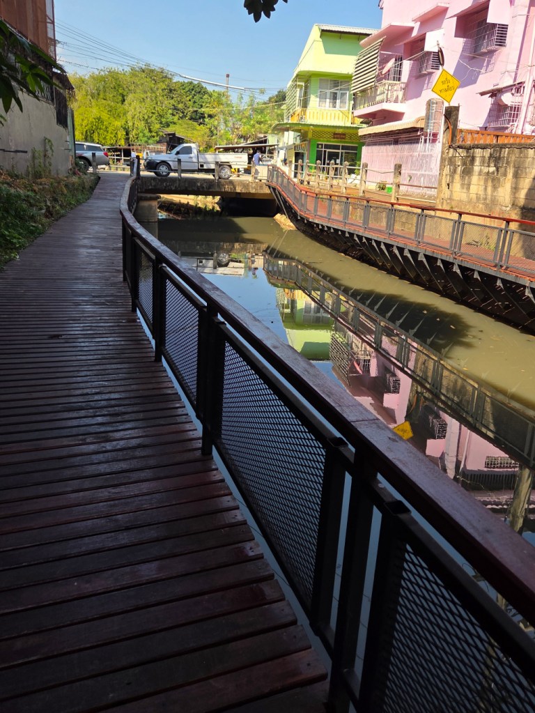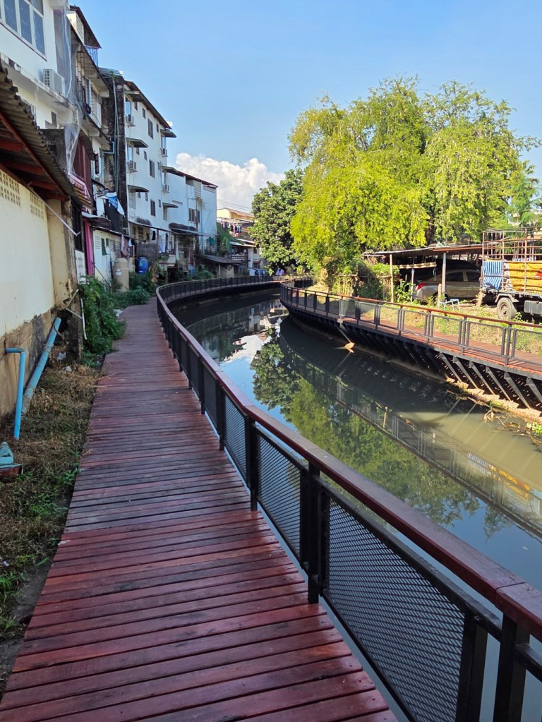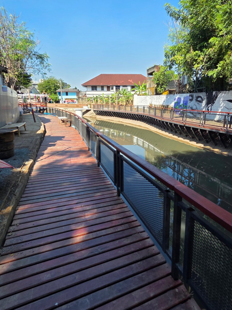 A view of the new platform along side Tha Phae Road with the new teak plank walkways leading down from the road to the side of the klong.
