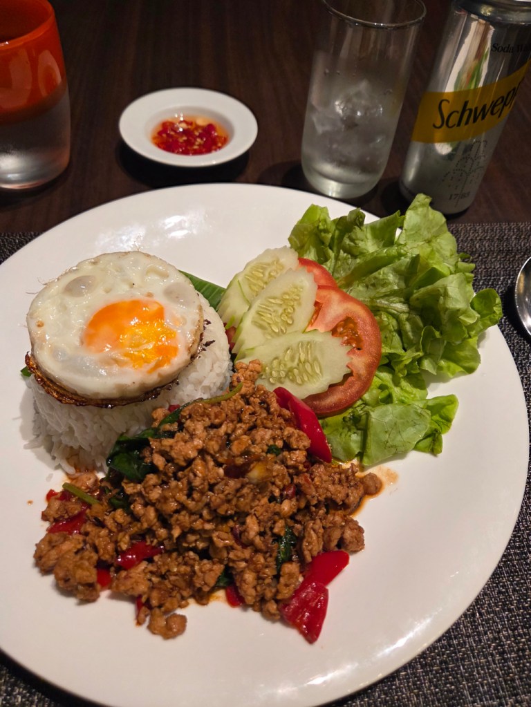 Pad Kaprow or Pad Kaphrao is the dish the Thais eat the most. It is also the Thai dish I eat the most. [Maybe I’ll photograph all of the Pad Kaprow I eat at various places for a photo comparison.] Pad Kaprow is ground meat, spices, and holy basil, also known as tulsi or tulasi. (Both basil and holy basil belong to the Lamiaceae family, commonly known as the mint family, and are part of the Ocimum genus. But they distinct species. Holy basil has a spiciness to its flavor.) Here is a meal of pad kaprow (this photo is from Bangkok) with rice and the traditional egg (and notice all the red chilis). Too spicy for me.