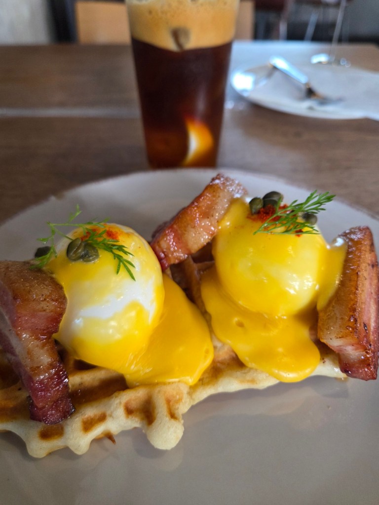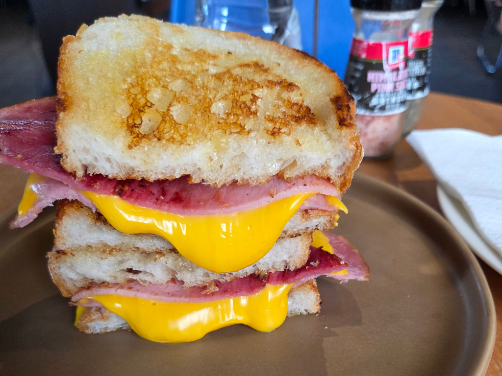 I do not eat lunch every day. If I eat a lighter breakfast and then have a strength training session at the gym or a yoga class and find myself hungry, I sometimes go to Me & Bacon. [I know, it is gramatically incorrect.] They have what might be the best grilled ham and cheese on sourdough. Not too big, not too small. A cheese that seems to be higher quality and tastier than American or some processed cheese (even though it looks like melted Velveeta). If I want something different, I might get the two poached eggs with bacon on toast with hollandaise.