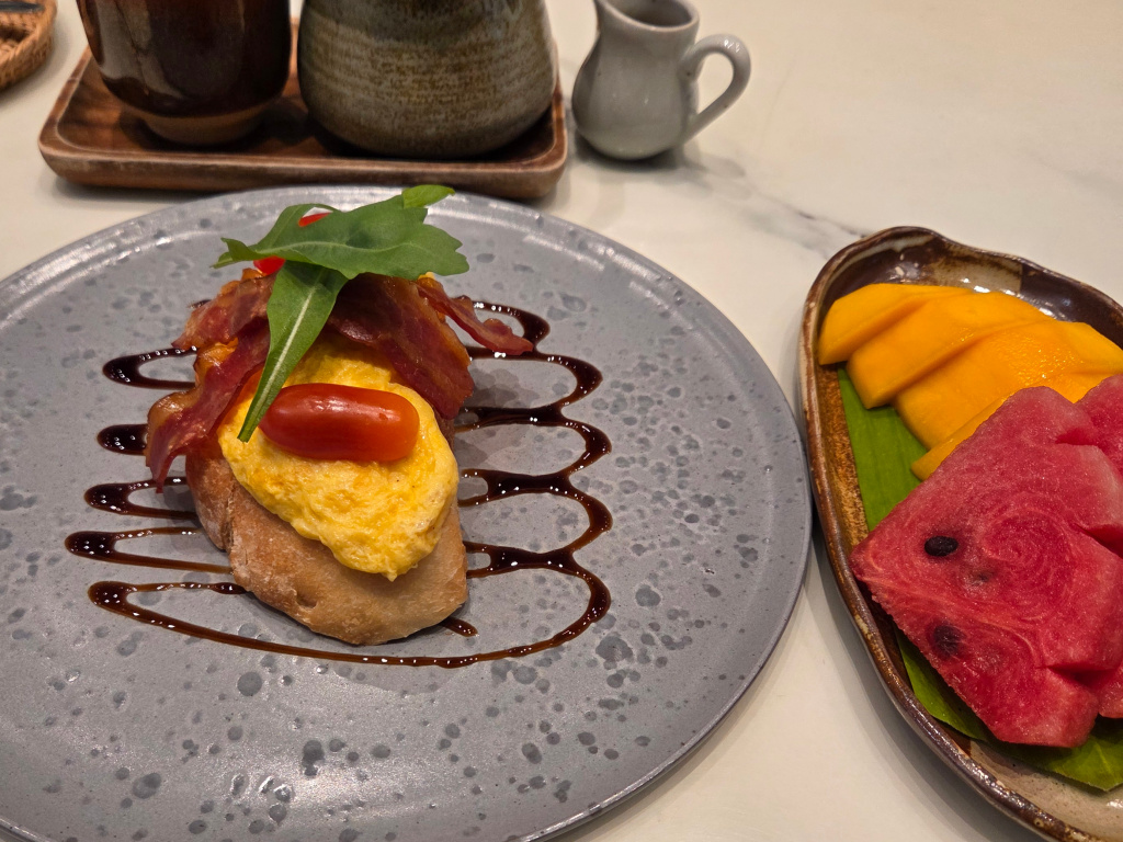For more protein-based breakfast I love what they call the Thai omelette (or “omelet” for those speaking American English…oh, that’s me, too…but I like the French spelling, it is just…sexier looking), a thin omelette with bell peppers over a mound of rice, or an omelette with bacon over a thick toasted bread.
