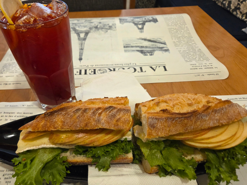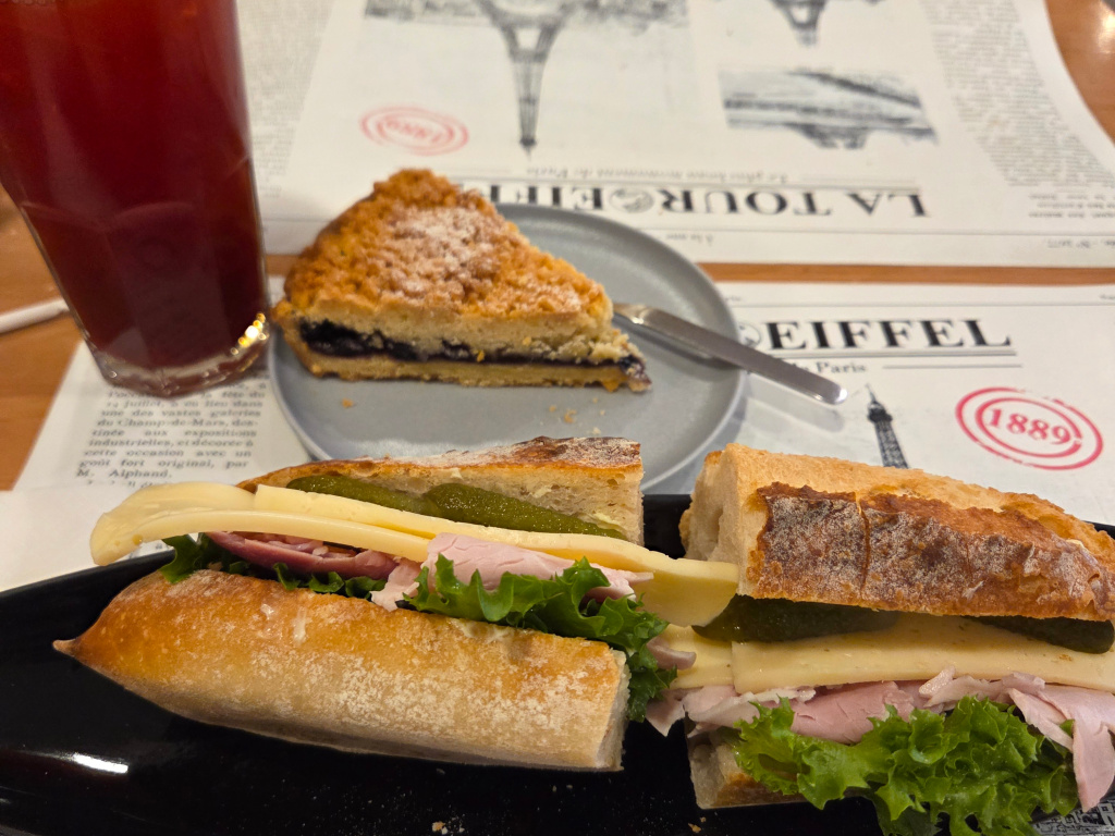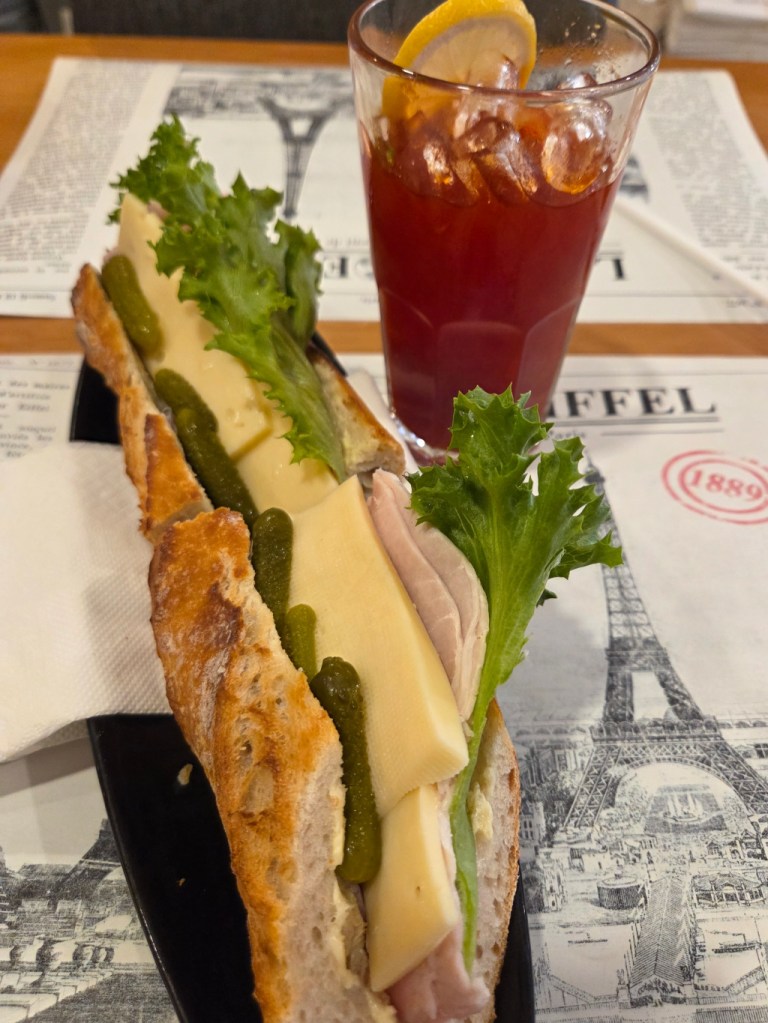 Here are two photographs of ham & cheese baguette sandwiches. In the second, I added a slice of blueberry crumble for a little sweetness after the baguette. Also note, in the ham & cheese baguette, they add in these very tasty little pickles.