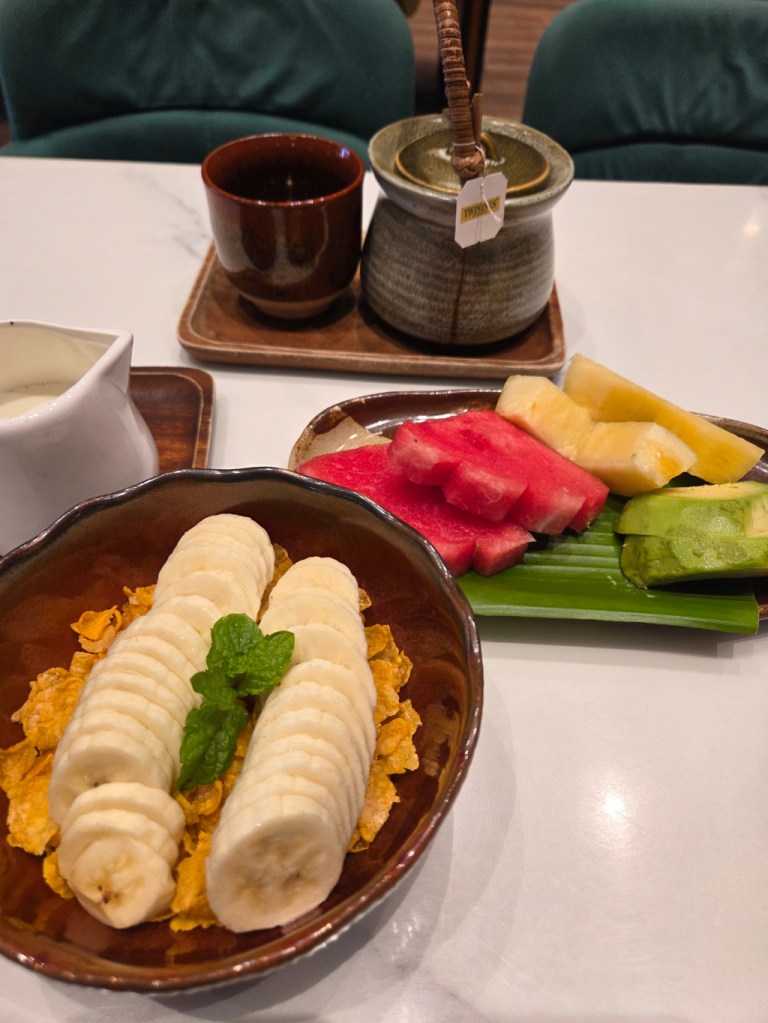 I have breakfast included with my room reservation at The 3-Sis. The attached restaurant, called “Poppy’s Kitchen” is where I eat breakfast and occasionally lunch or dinner. There are so many good places to eat in Chiang Mai and I am at Poppy’s Kitchen every morning, so I seldom eat other meals there. Breakfast varies. If I am having a strength training session or yoga at Wild Rose in the morning, my breakfast is typically less protein-based, and I might have oatmeal or corn flakes with a banana and a small dish of other fruit. Here is a breakfast of corn flakes with a banana, a fruit dish with watermelon, pineapple, and avacado, and jasmine tea.