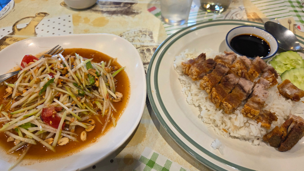 And both somtum and crispy fried pork with rice:
