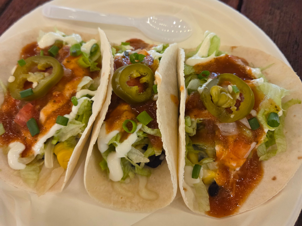 And finally one of the meals I return to many times, the vegetarian tacos at Wrap ‘n Roll Burritos at Phaploen Market. Phaploen Market is an outdoor food court with many small food shops in a horseshoe shape and a band or performers at the open end. While looking for a smaller meal after having breakfast and a late lunch, I came to Wrap ‘n Roll Burritos and rtied their vegetarian soft tacos. They have black beans, corn, lettuce, sauce, and a jalapeno slice. Three is just right when I’m hungry but not ravenous.