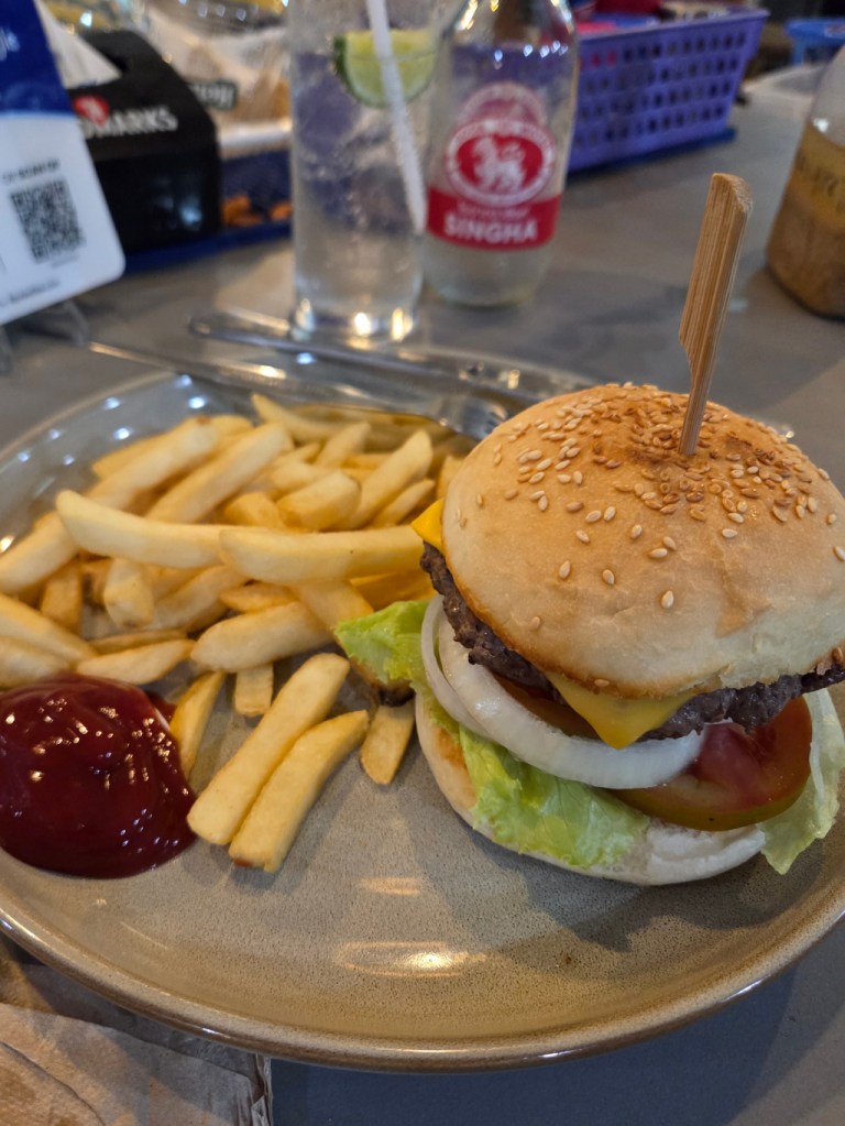 Mad Dog has been here for many years. Long ago, it was called Mad Dog Farang Food and was allegedly one of the first places to offer American or European style food. (A “farang” refers to a light-skinned American or European.) I go there occasionally when I want a smaller meal. I was on my way to Mad Dog two years ago when a loud motorcycle startled me, I jerked away and hit my head on the edge of a metal sign. I thought it was just a bump (a large bump), but it started bleeding. The ladies at Mad Dog got ice and urged me to go to the hospital to get it checked. I ultimately did and it took six stitches to close the gash properly. Nevertheless, the ladies at Mad Dog still remember that. Unlike The Duke’s, the meals at Mad Dog are smaller. I like their beef stew, and sometimes I get a salad, cheeseburger and fries (again, nowhere neary as good as Chief’s fries).