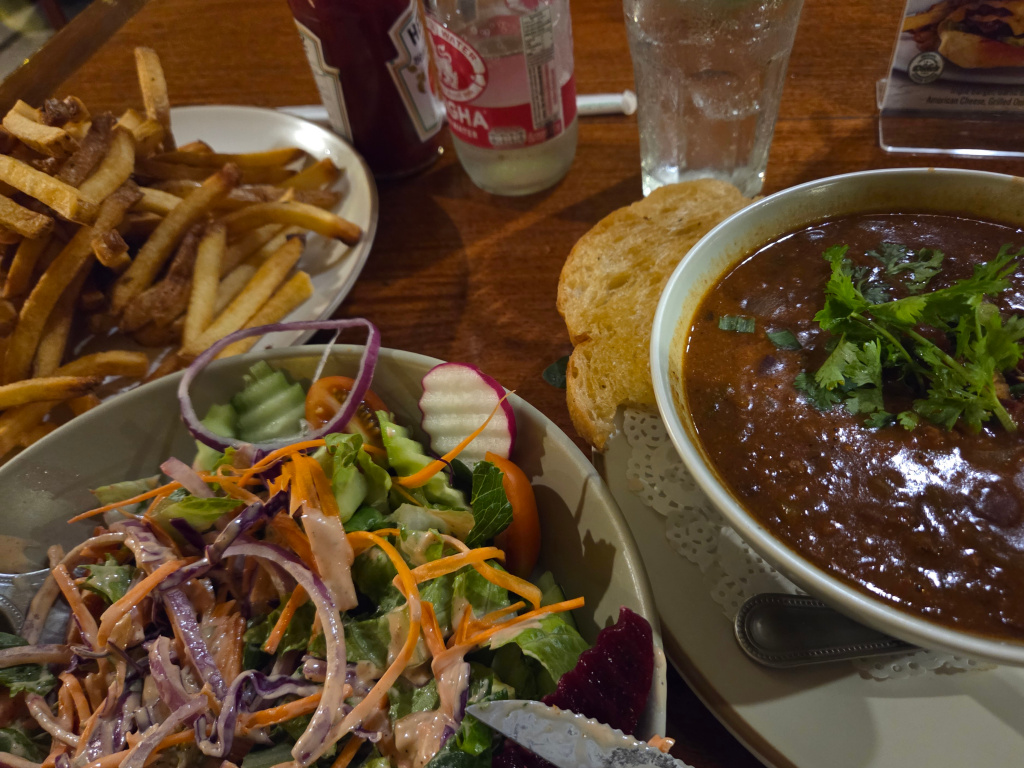 A favorite at The Duke’s is their burgers. So far this winter, I have not had a burger at The Duke’s. I will at least once before I leave, because they are very good. My first meal at The Duke’s this winter was a salad, their country chili, and French fries. The French fries are (in my opinion) the best in Chiang Mai. While good or even excellent, the fries at The Duke’s remind me that my all-time favorite fries (and chili and burgers) are at Chiefs Burgers and Brew in Solana Beach, California, not far from my home. I am a regular at Chiefs because I love their food so much (the burgers, the tri-tip tacos, the pulled-pork sandwich, the tri-tip sandwich, the chili, chili-rice bowls, the potato salad, and especially those French fries…Chief’s fries are the best!) Back to The Duke’s. The chili dinner with the good fries way over in the left: