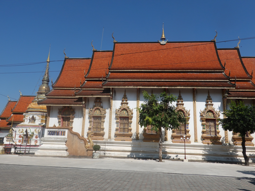 I took a photograph of the side of the viharn (assembly hall or worship hall) with the chedi behind it. This is a large viharn and I have been interested in seeing inside. But the doors (would be on the right of the photograph) have been closed each time I have been here, so I have never seen inside.