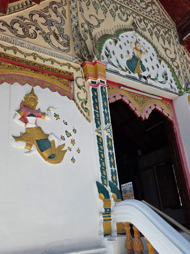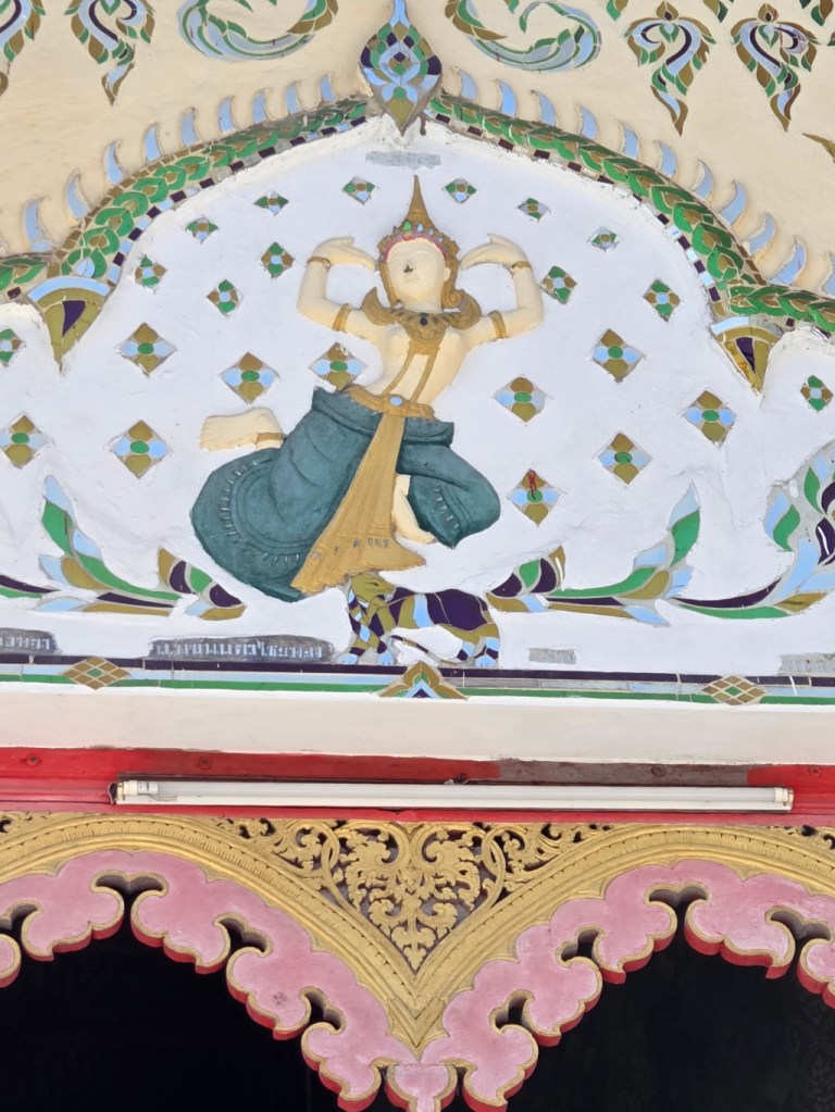 The front of the viharn (assembly hall) is simple with understated artistic thewadas depicted (a thewada is a angelic being that lives in the heavenly realms). There are my favorite – artistic, playful, and fun.