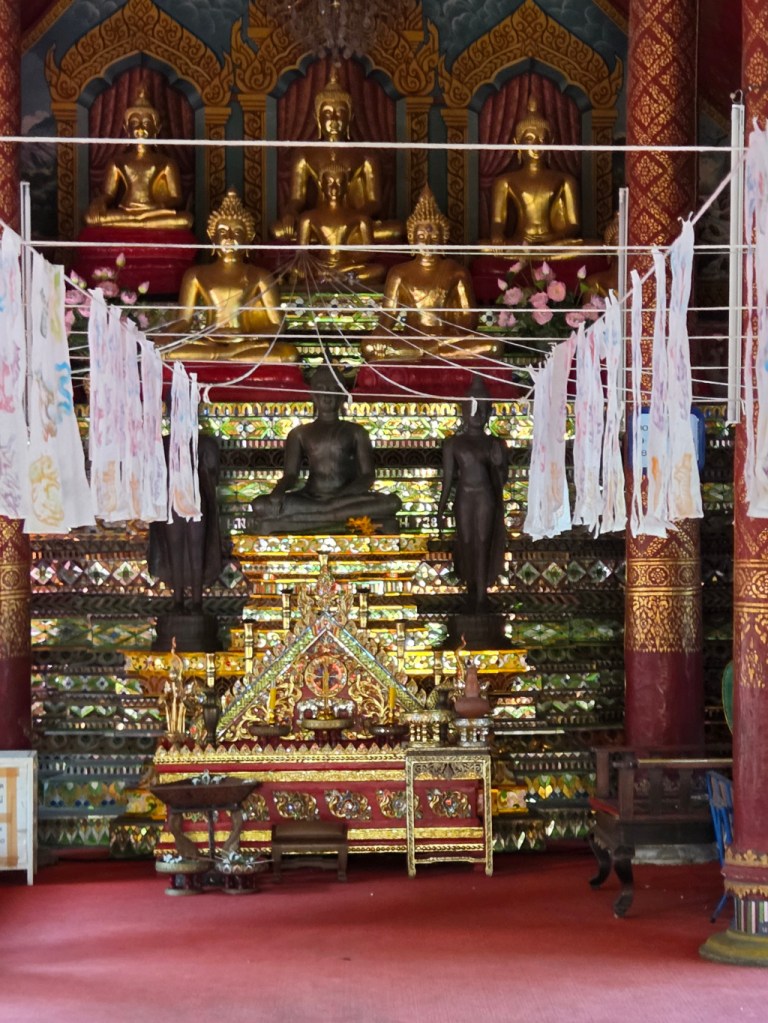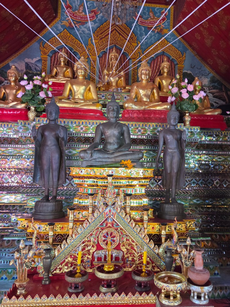 The inside of the viharn has a more somber, serious feeling, with the darker mood enhanced by the dark colored Buddha images on the altar.