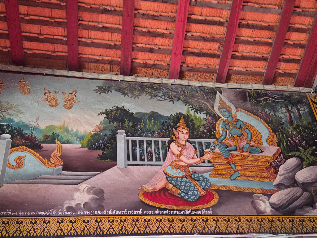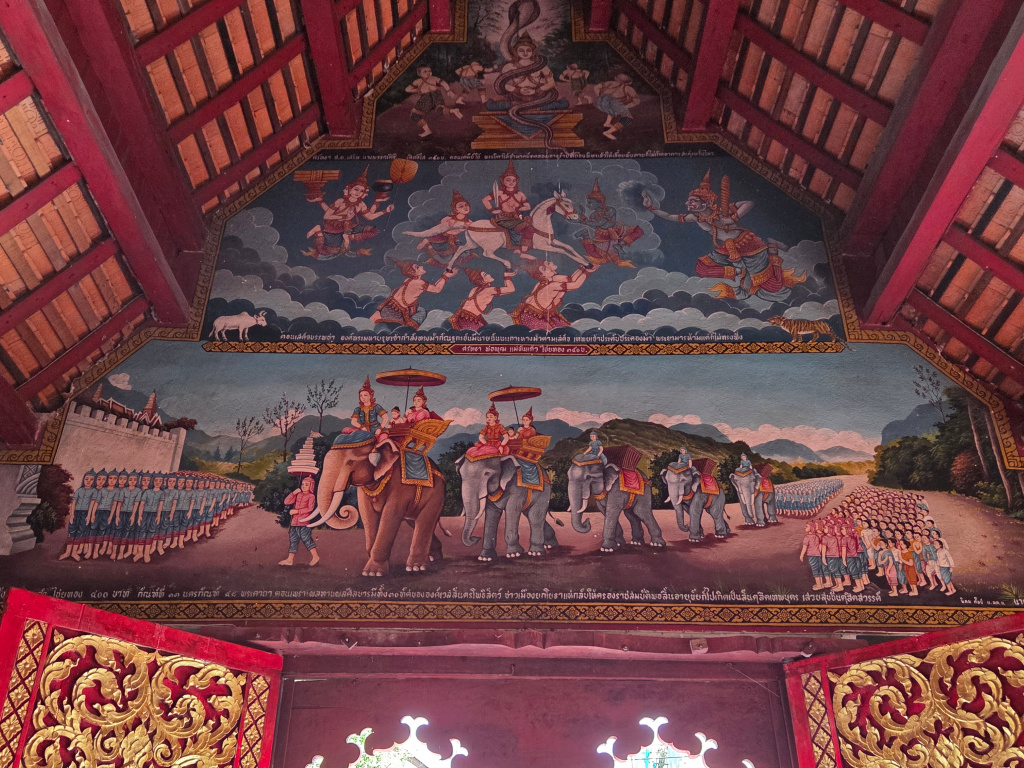 High up on the walls above the windows are large paintings or murals, much like inside the viharns at most temples. If I knew how to interpret the murals, they tell a story about the Buddha and/or the history of the temple. First, two of the paintings on one side of the viharn.