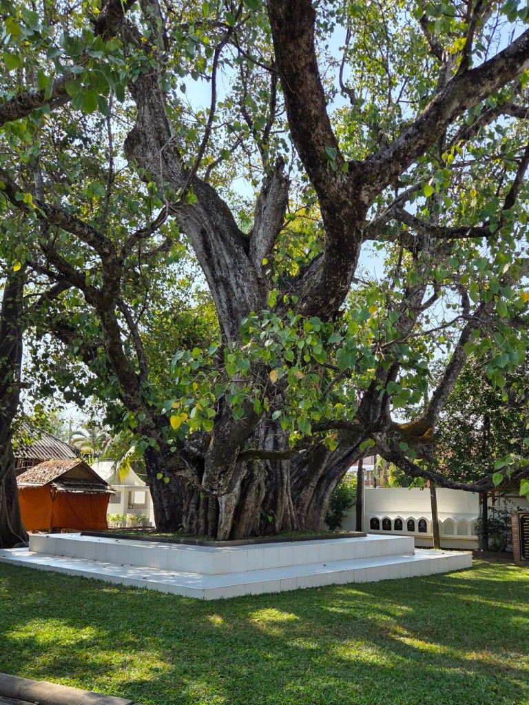 On the other side of the chedi and standing Buddha pavilion is this old and beautiful tree. It has what appears to be a seating area around its base.