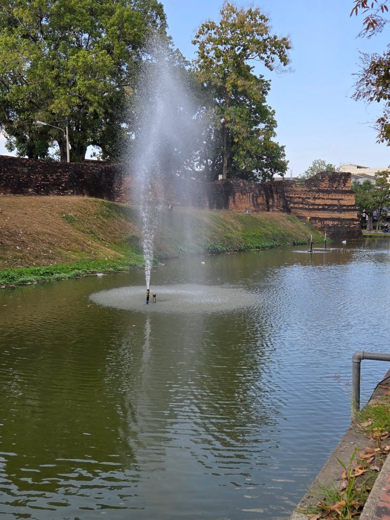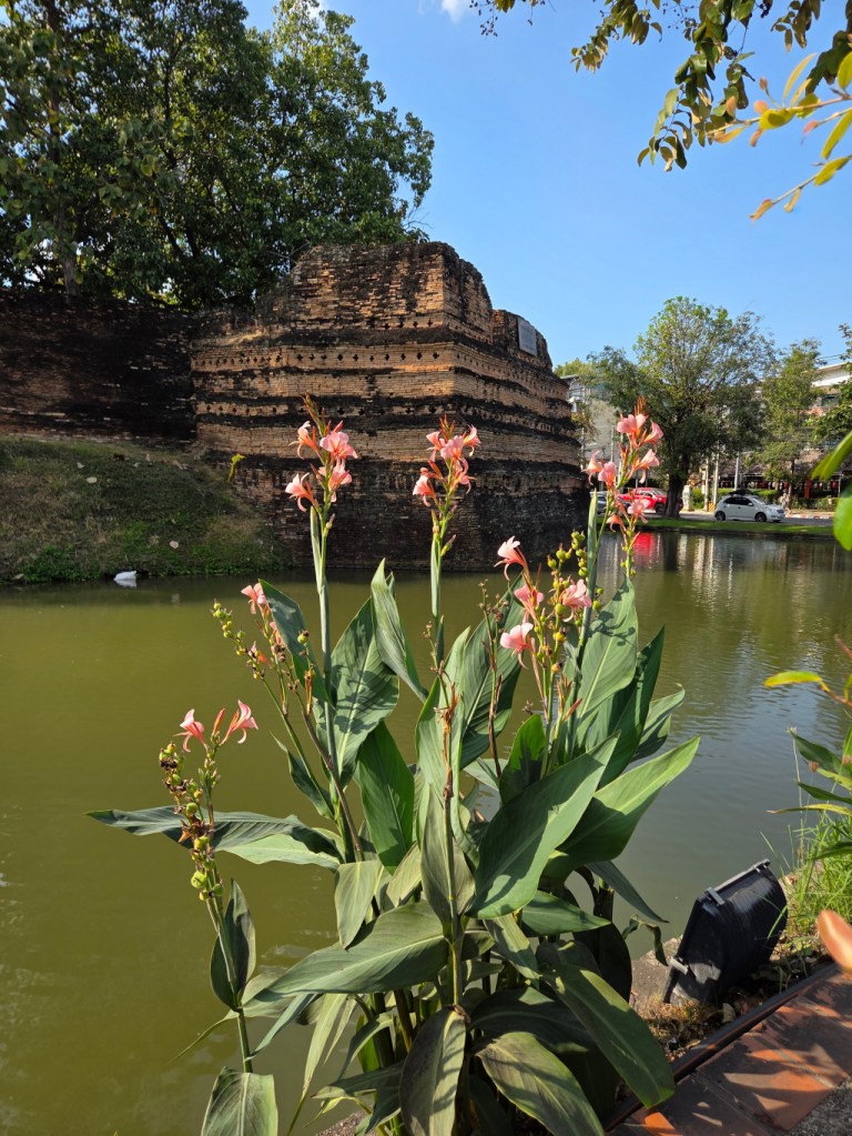 A few photos I took while walking in Chiang Mai over a couple of fairly routine days. First, while walking back to The 3-Sis from the French boulangerie Chouquette I passed by Sri Phum Corner, the northeast corner of the old city wall. The first photo is looking north at Sri Phum Corner through some flowers growing along the side of the moat. The second photo is from farther south looking back at the corner and part of the wall that still exists near the corner.