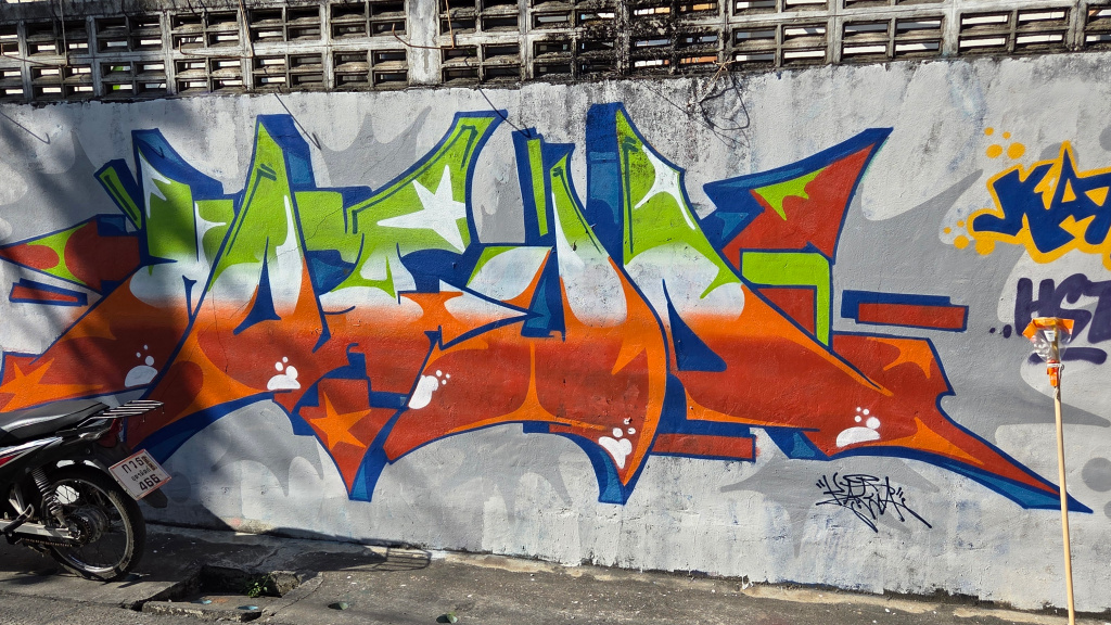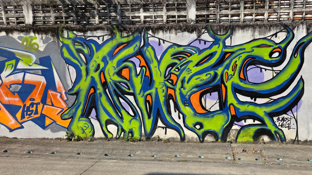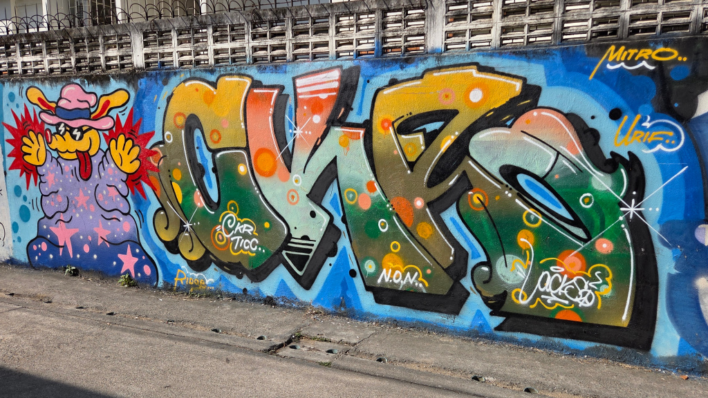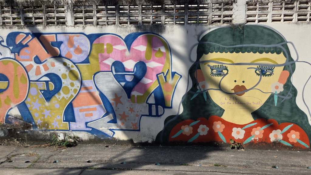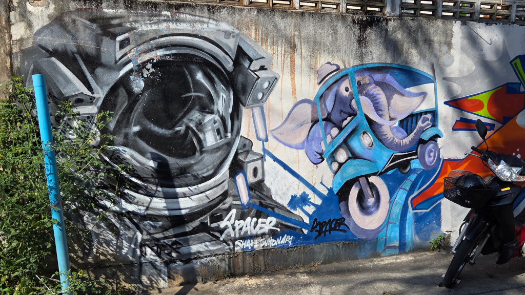 In many places in Chiang Mai, and probably many other places, there is some quite beautiful and very skillfully painted street art. I showed some of this art close to Wild Rose Yoga in a previous post ( https://james-intrepid-pilgrim.blog/2025/12/31/a-day-in-the-life/). The street art I saw today is a fairly long stretch (and unfortunately, some of the art has been covered with graffiti):
