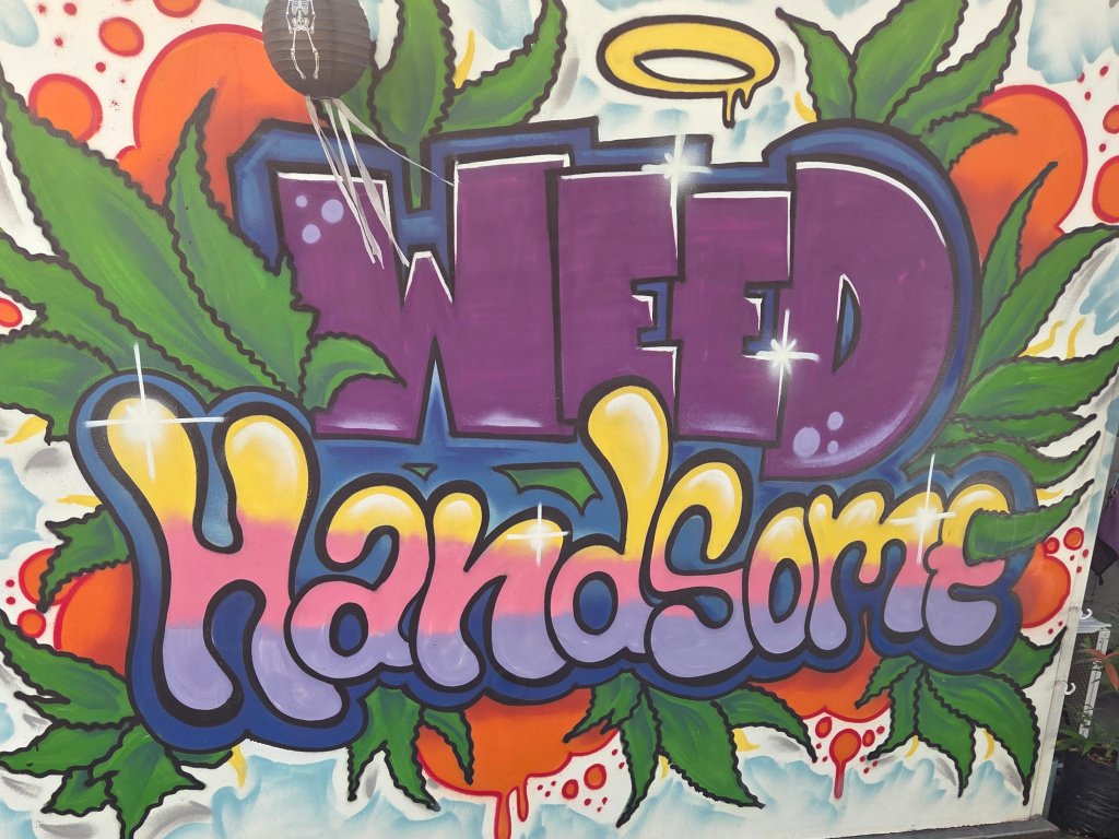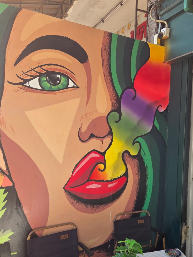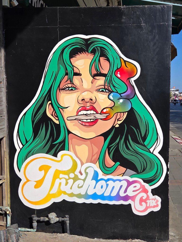 The next day, I was walking through near Wild Rose Yoga the sois and saw what is a sign that clearly looks like street art. This is for one of the many, many cannabis shops in Chiang Mai, this one called Weed Handsome.