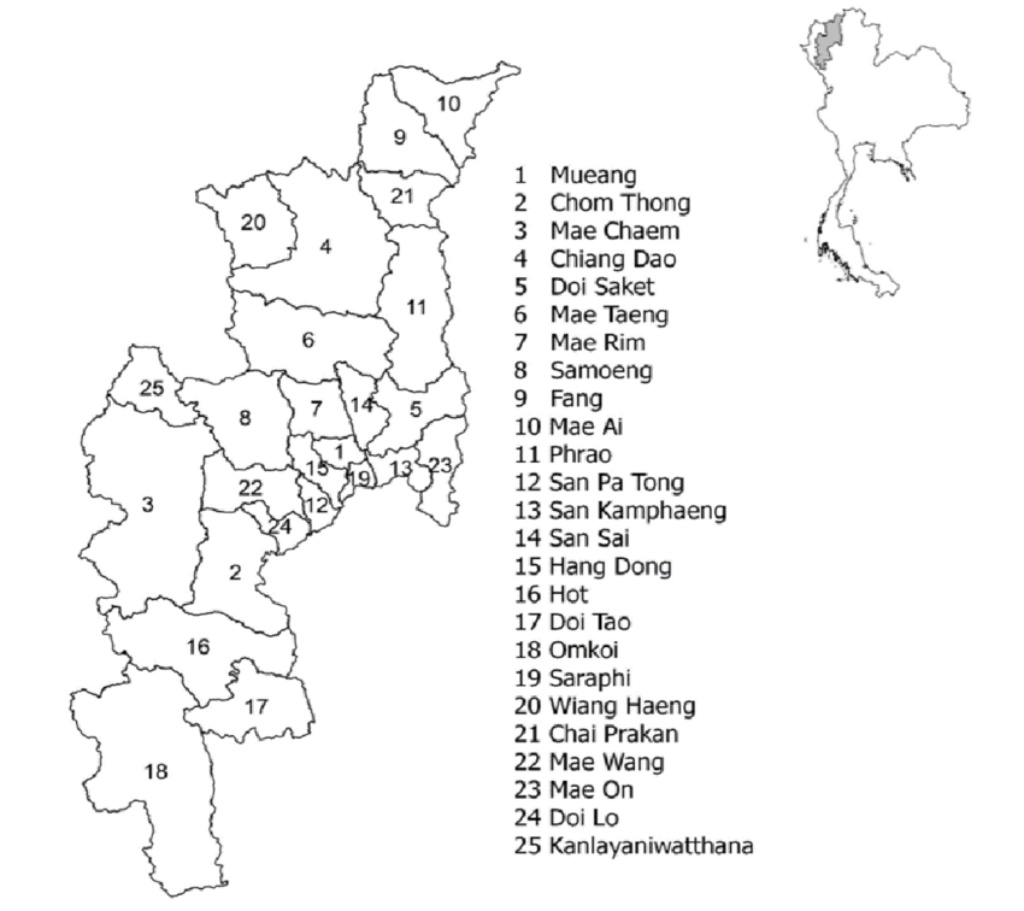 Thailand has 77 provinces. Chiang Mai Province in northern Thailand is relatively large, and includes 25 districts. The Hang Dong District of Chiang Mai province is a large, rural district south and west of Chiang Mai city (although there are other larger districts). Here is a map of the districts of Chiang Mai Province. Number 1, “Mueang” is the city of Chiang Mai itself. Number 15 is the Hang Dong district.