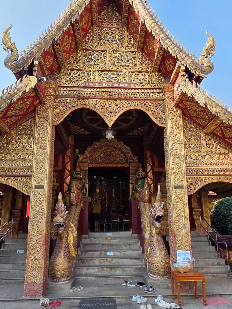 Because the Wat Sri Suphan has been renovated and redesigned a number of times, little remains of those original buildings except some teak pillars and supports which can be seen in the new viharn. First we visited the viharn and its intricately detailed front facade.
