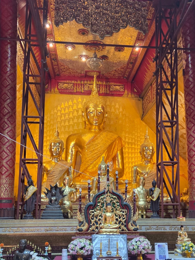 Inside, there was preparation for something taking place with some scaffolding and hanging decorations, so it was difficult to get a clear photo of the main Buddha image at the altar. The large Buddha with the gold background is impressive and contrasts with the silver we will see very soon.