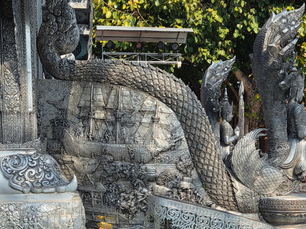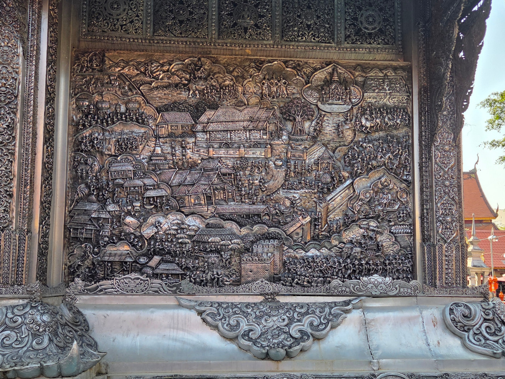 “Repoussé” working literally means “pushed from behind” and refers to the working of the malleable metal sheets from behind with hammers creating reliefs. “Chasing” is the opposite and refers to the working of the metal from the front to create the finished design. Both methods are used for the decoration of the Silver Ubosot at Wat Sri Suphan.