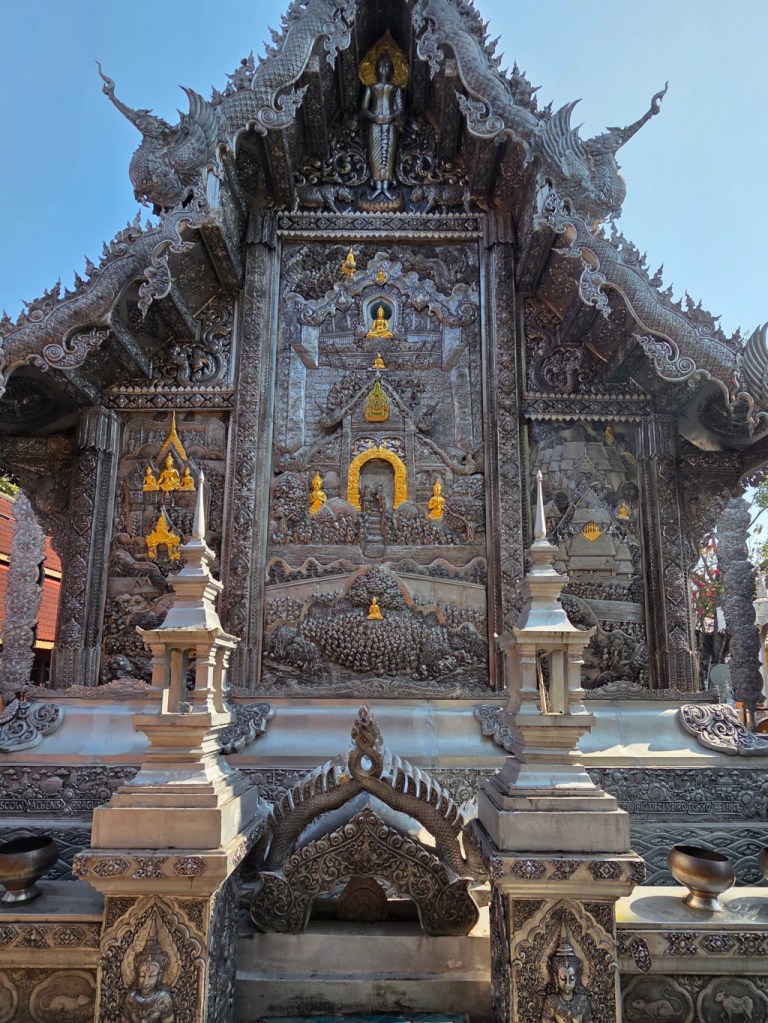 I have posted many, many photos of the silver ubosot at Wat Sri Suphan over the years, so I’ll only post a few here. First, our first view as we walked towards the silver ubosot.