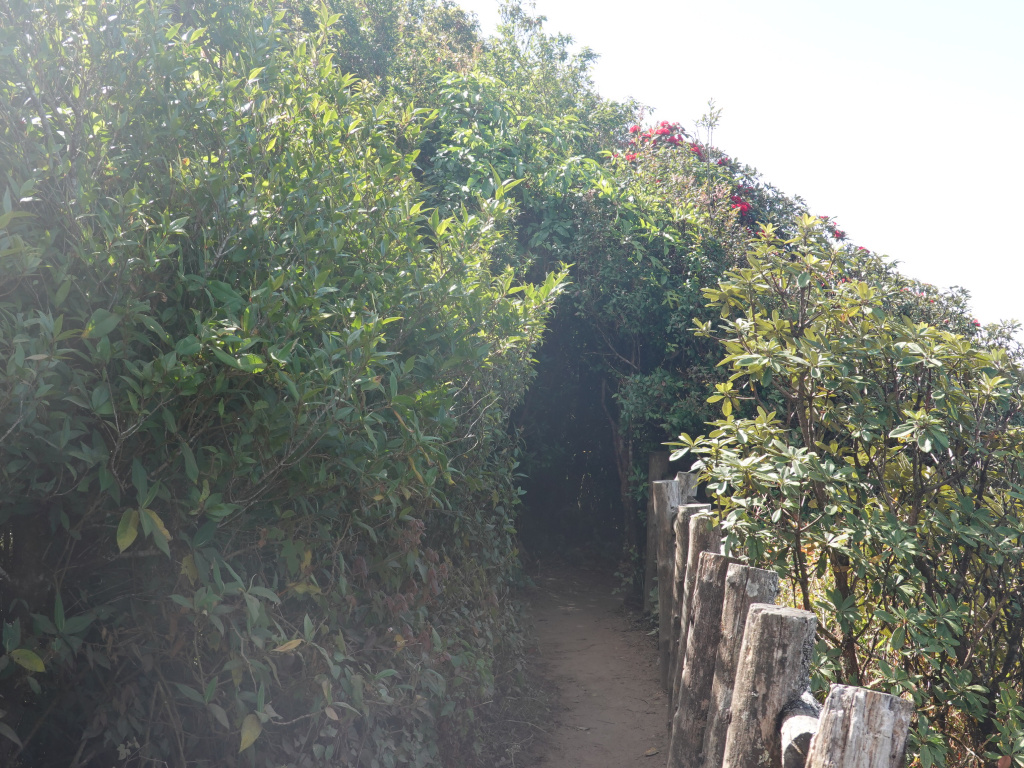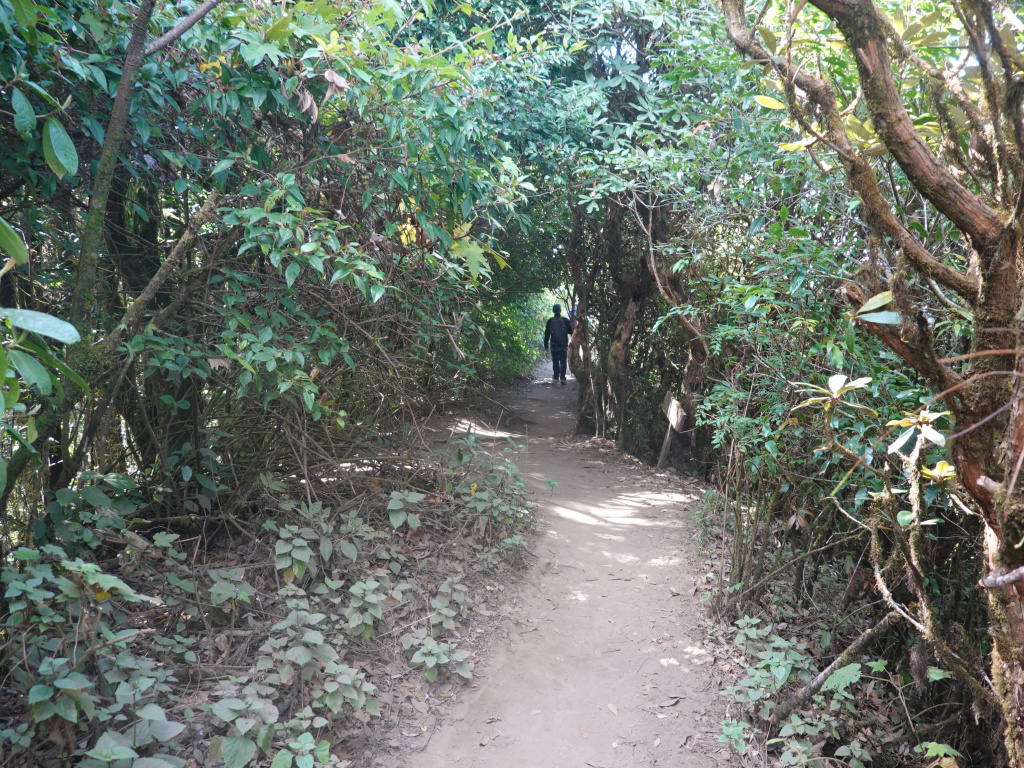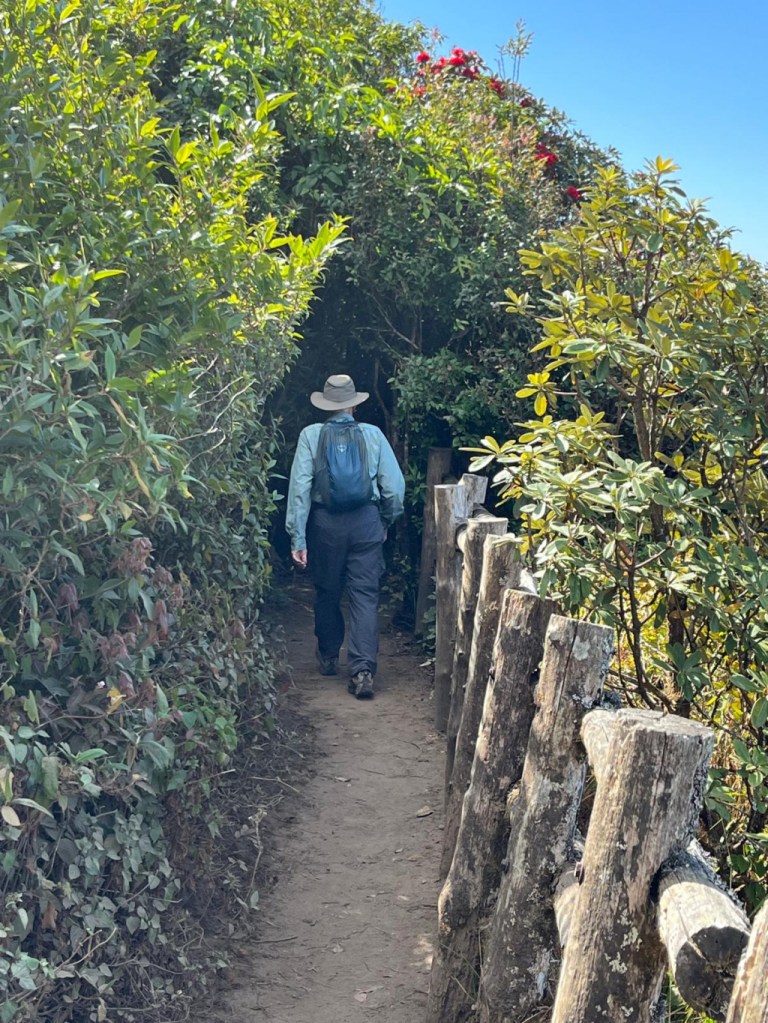 Then we entered the forest again in what looked almost like a tunnel. I took a photo, and then Esther took a photo of me going into back the forest. Notice a few rhodendron flowers at the top of the photos.
