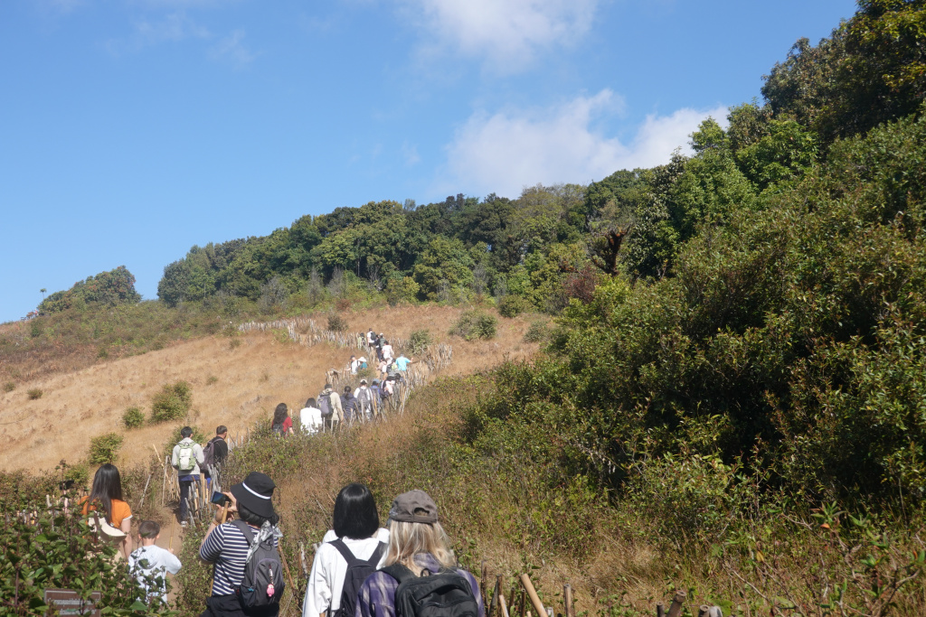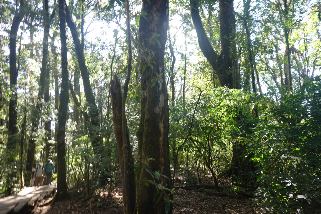 Doi Inthanon is the highest mountain in Thailand with the peak at 2,565 meters above sea level (8,415 feet). Located southwest of Chiang Mai, the drive to get there is about 2-1/2 hours, so going there, spending time at the mountain, and coming back would take up a whole day. For all of the winters I have been coming to Chiang Mai, people have asked if I had been to Doi Inthanon or strongly recommended that I make the trip. For no real reason, I have never made the trip to Doi Inthanon. My friend Esther is in Chiang Mai this week for her first visit, and on her list of things she wanted to do was to visit Doi Inthanon. As she was booking the tour at The 3-Sis, I thought this is a good opportunity to finally go, and decided to join her. The tour included a drive to the mountain, a hike of 8.5 kilometers up and around the mountain, a visit to the actual peak, lunch at a market, a visit to the temples built to honor the 60th birth anniversary of King Bhumibol Adulyadej (King Rama IX) in 1987, and the 60th birth anniversary of Queen Sirikit in 1992, and finally a visit to a large picturesque waterfall.