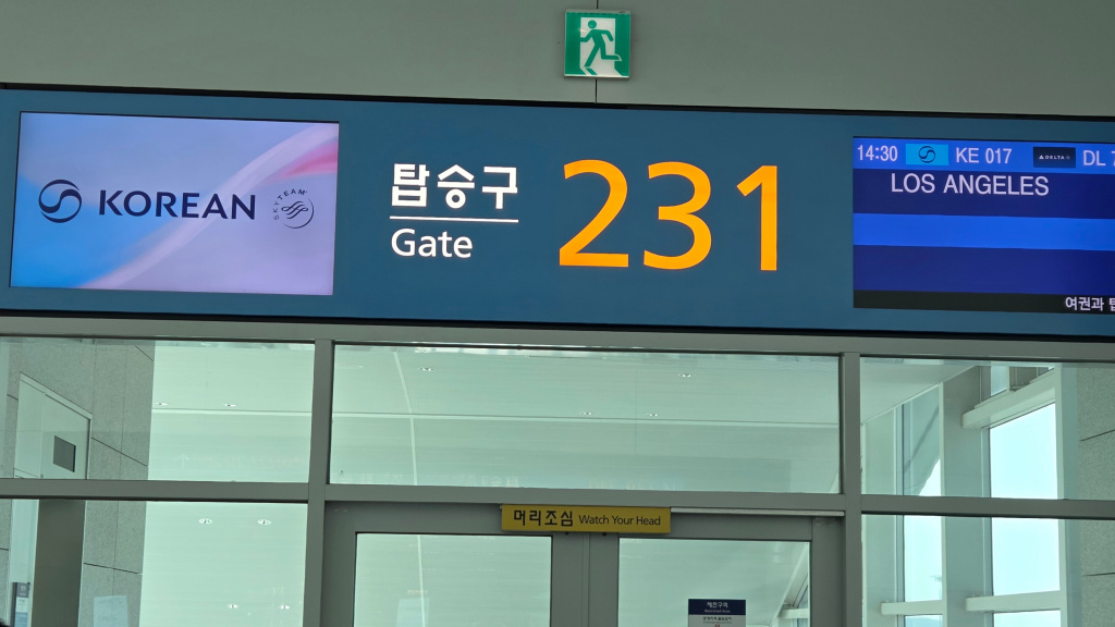 I was in the room and asleep by 8 AM, slept soundly, and woke to my alarm at 1 PM. Showered, checked-out, and headed to Gate 231 for flight KE017 to Los Angeles.