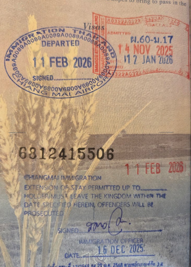 I have been in the Kingdom of Thailand for exactly 90 days. When entering, people from many countries get a 60-day tourist visa exemption, meaning you are exempt from needing a visa and you can stay for 60 days. That can be extended for an additional 30 days at an immigration office, which is what I did. Today, February 11 is the last day I can be in the Kingdom. I thought the immigration officer would make a comment that I barely made it with only an hour until the deadline, or at least raise an eyebrow, but there was no reaction, only an exit stamp in my passport. In the photo, you can see that I entered the Kingdom on November 14, my extension last day is February 11, and my departure stamp shows February 11.